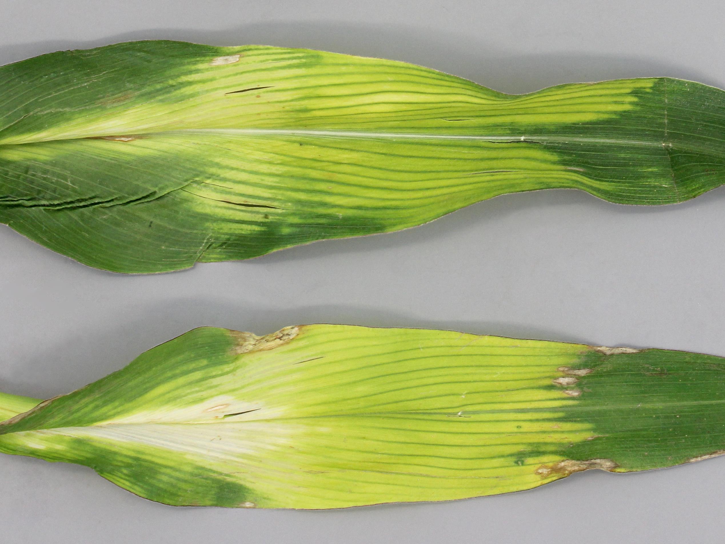 Légende: Feuilles de maïs avec blanchiment internervaire
