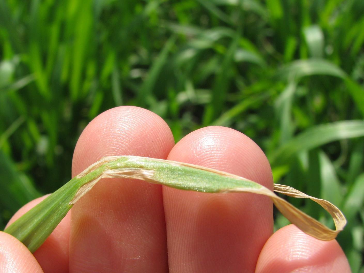 Description: Une feuille de blé présente un blanchiment accompagné d'une brûlure des tissus, d'étendue variable, à plusieurs endroits sur le limbe ou à la marge du limbe. Ces symptômes sont causés par l’herbicide PumaMD (fénoxaprop-p-éthyl). Un stress climatique (nuits fraîches et journées chaudes) peu avant ou peu après l’application de l’herbicide aurait provoqué l’apparition de ces symptômes. Le rendement de la culture n'en serait pas affecté.