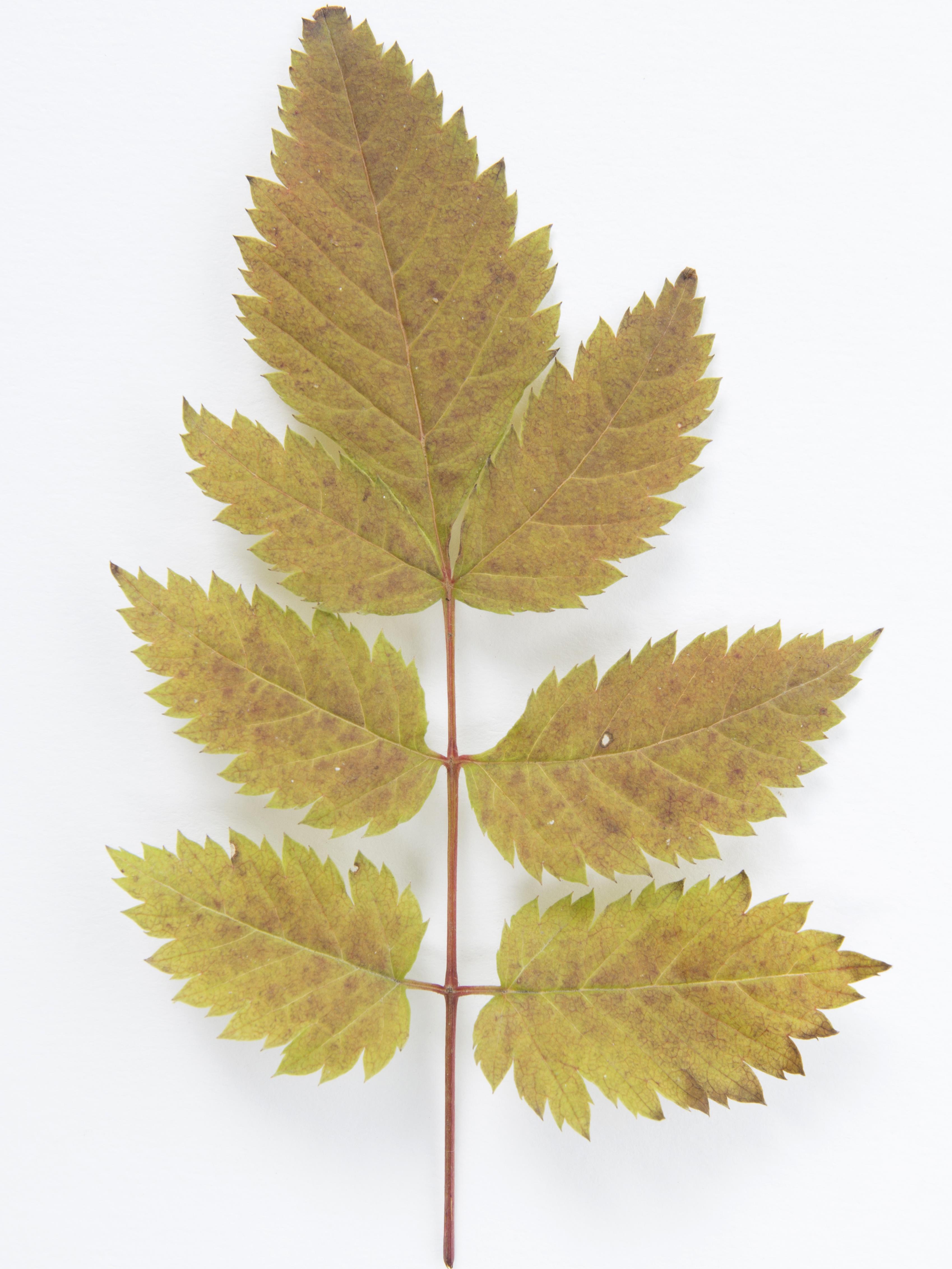 Description: Les tissus d’une feuille d'Aruncus dioicus (Barbe-de-bouc) présentent un aspect de bronzage/brunissement, localisé entre les nervures et à la marge de plusieurs folioles. Ce symptôme est apparent sur les deux faces du limbe mais de façon plus prononcée à la face supérieure. De petites taches jaunes ressemblant à des mouchetures sur les feuilles sont aussi apparente (non visible ici) mais sont reliées à des dommages d’alimentation causés par le tétranyque à deux points, Tetranychus urticae. Ce dernier se nourrit du contenu des cellules végétales, ce qui peut nuire à l'activité photosynthétique de son hôte. Dans la pépinière, environ 95% des plants montrent des symptômes de bronzage/brunissement ou, à un stade plus avancé, des brûlures sur les feuilles. Ces dommages sont apparus soudainement. Le dosage chimique de l’échantillon a révélé une concentration très élevée d’indaziflam (Alion), un herbicide appliqué dans la pépinière. D’autres matières actives ont également été retrouvées, dont le spirotétramate (Movento), un insecticide : ces autres produits ne seraient pas en lien avec les symptômes observés. Une surdose de l’herbicide indaziflam peut expliquer l’effet de bronzage ou les brûlures observés sur les feuilles.