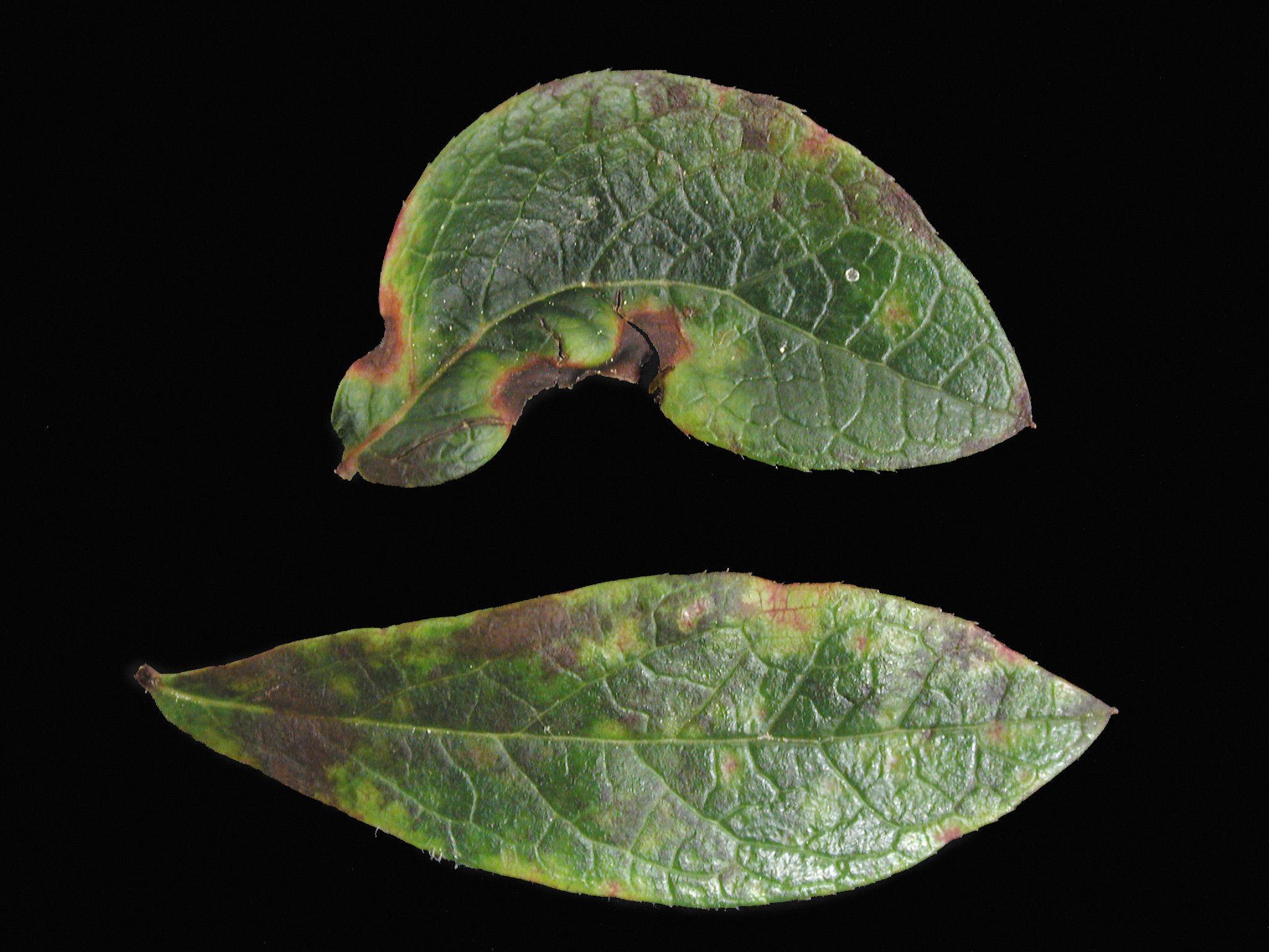 Légende: Taches et malformation sur feuilles de bleuet en corymbe