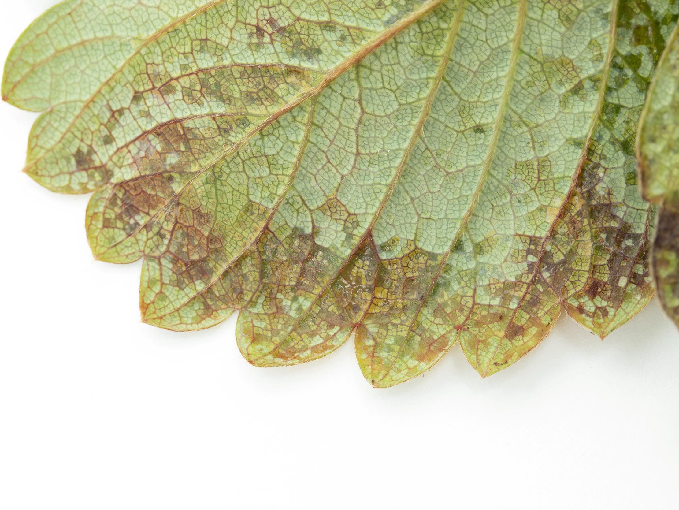 Légende: Tache angulaire (Xanthomonas fragariae) sur la face inférieure d'une foliole de fraisier.
