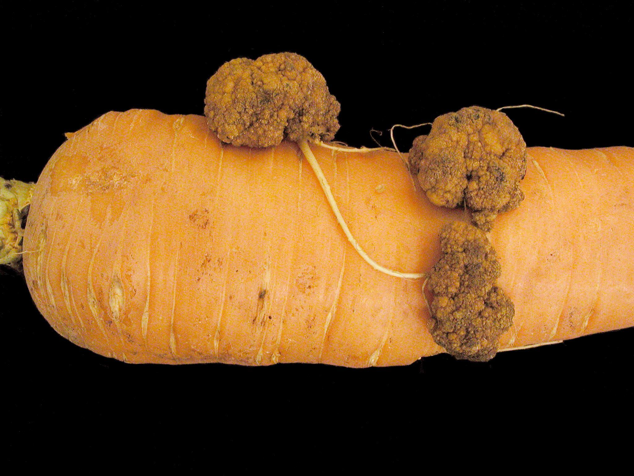 Description: Sur une carotte (cv 'Apache F1') prélevée au champ, présence de tumeurs brunes, plutôt rondes, situées sur un seul côté et dans la moitié supérieure de la racine. Il y a 2 à 3 tumeurs par racine et leur dimension varie entre 0,5 et 5 cm de diamètre. Les tumeurs font irruption au travers de l’épiderme à partir des lenticelles ou du point d’attache des racines latérales sur la racine pivot. Bien que les tests de laboratoire se soient avérés négatifs pour la détection de la bactérie Agrobacterium tumefaciens, responsable de la tumeur du collet, il n’en demeure pas moins que les symptômes sont caractéristiques de cette maladie.