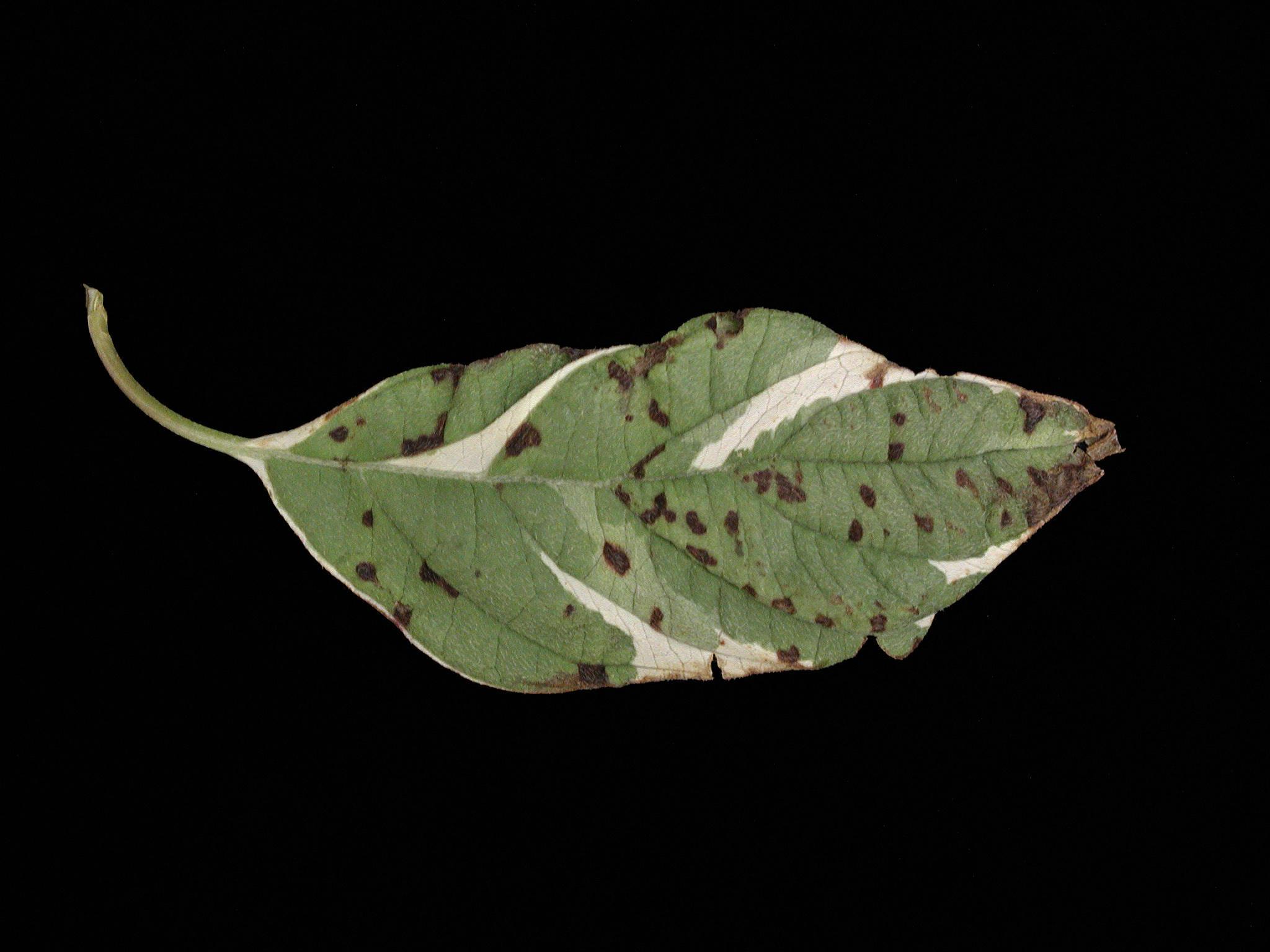 Description: Sur une feuille de cornouiller blanc (cv 'Elegantissima') provenant d’une pépinière, présence de nombreuses taches pourpres foncées à noires, elliptiques à angulaires et d’une dimension variant entre 1 et 4 mm. Elles sont réparties au hasard sur le limbe. Les tests de laboratoire ont révélé la présence de la bactérie Pseudomonas syringae, responsable de la tache bactérienne.