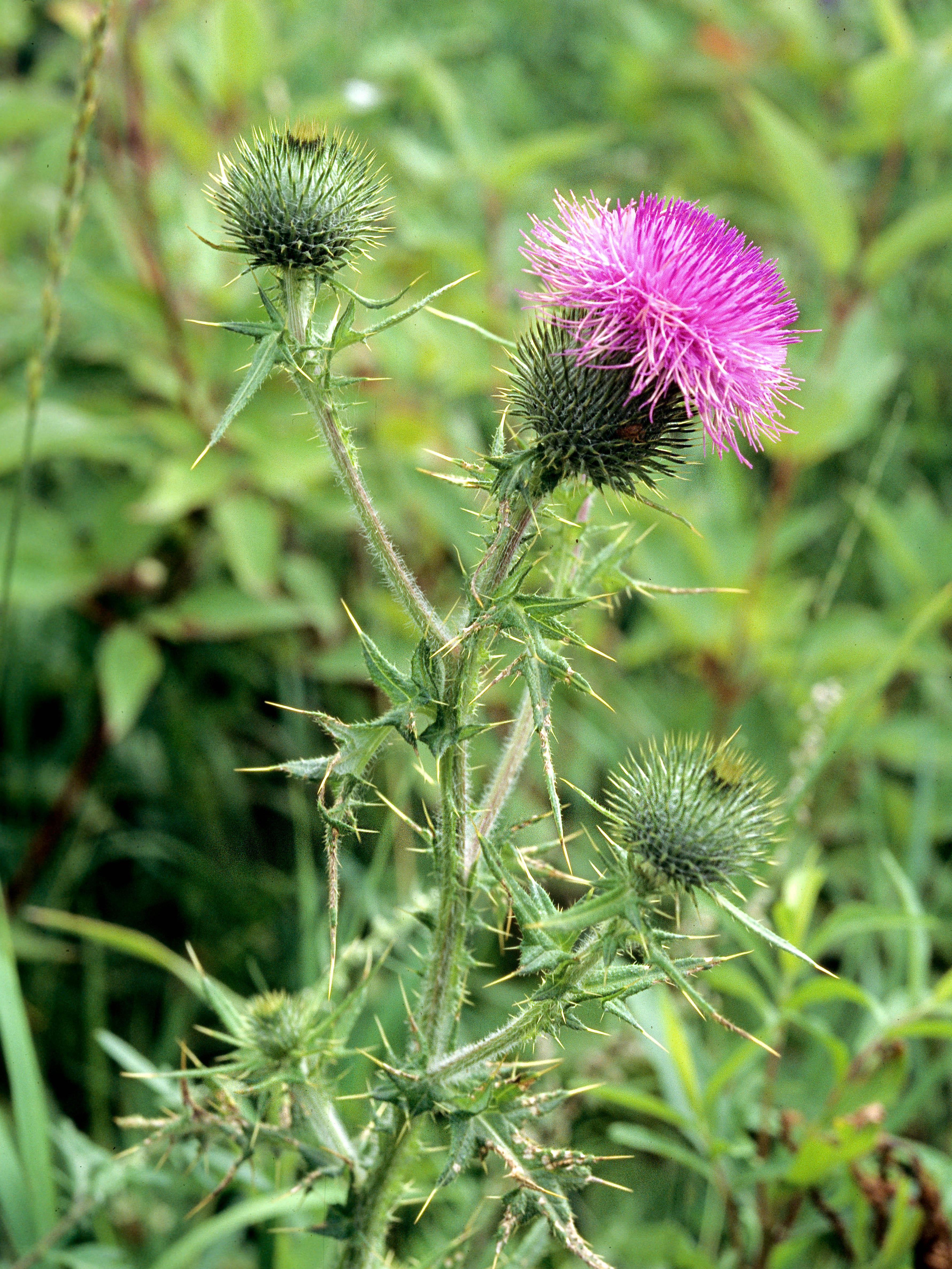 Légende: Fleurs pourpres réunies en capitule, bractées et feuilles épineuses