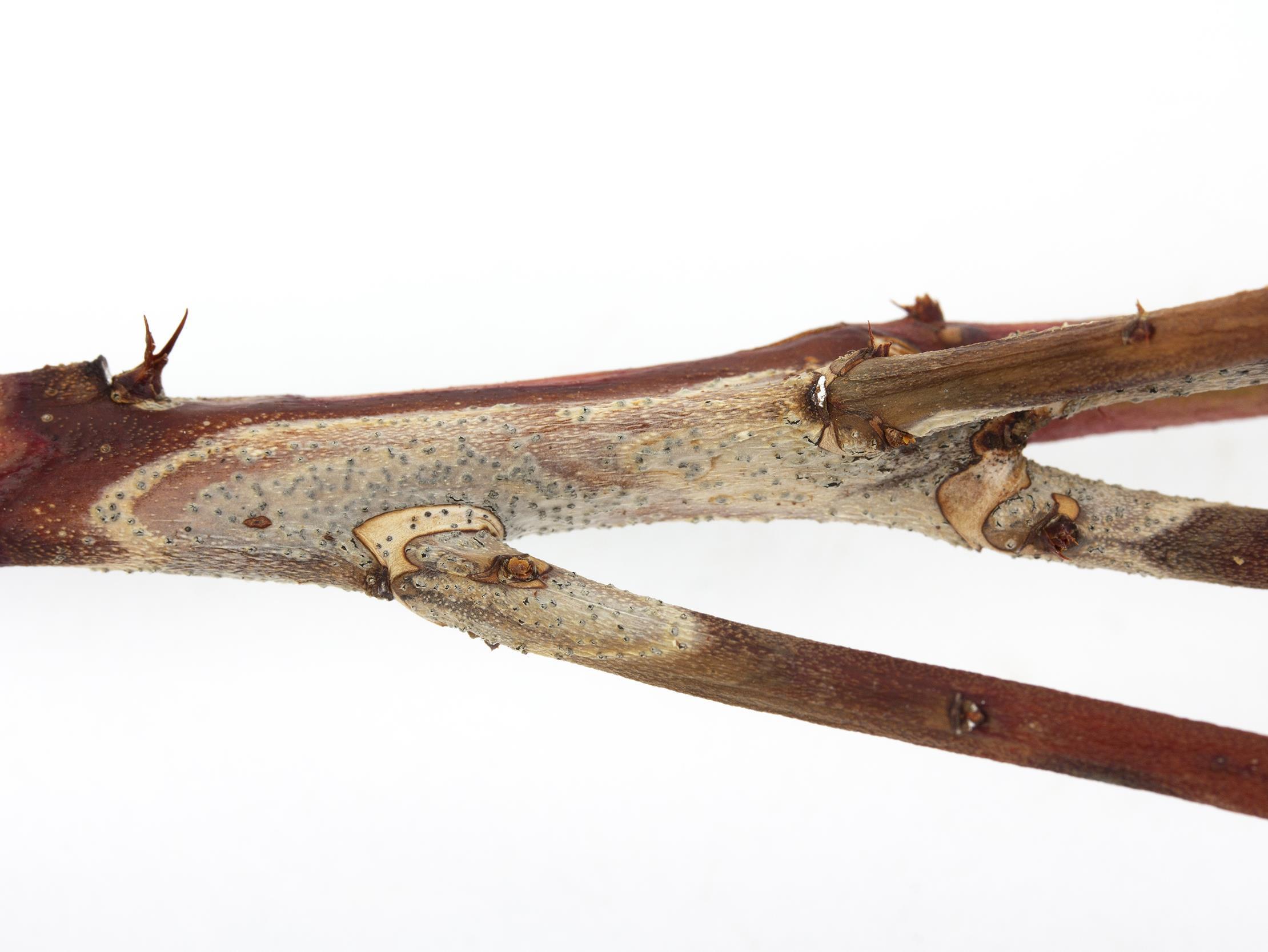 Description: Sur cette tige de bleuetier en corymbe, on observe un long chancre elliptique grisâtre, sur lequel on retrouve plusieurs pycnides noirs. Les tests de laboratoire ont révélé la présence du champignon Fusicoccum putrefaciens, responsable du chancre à Fusicoccum chez le bleuet en corymbe.