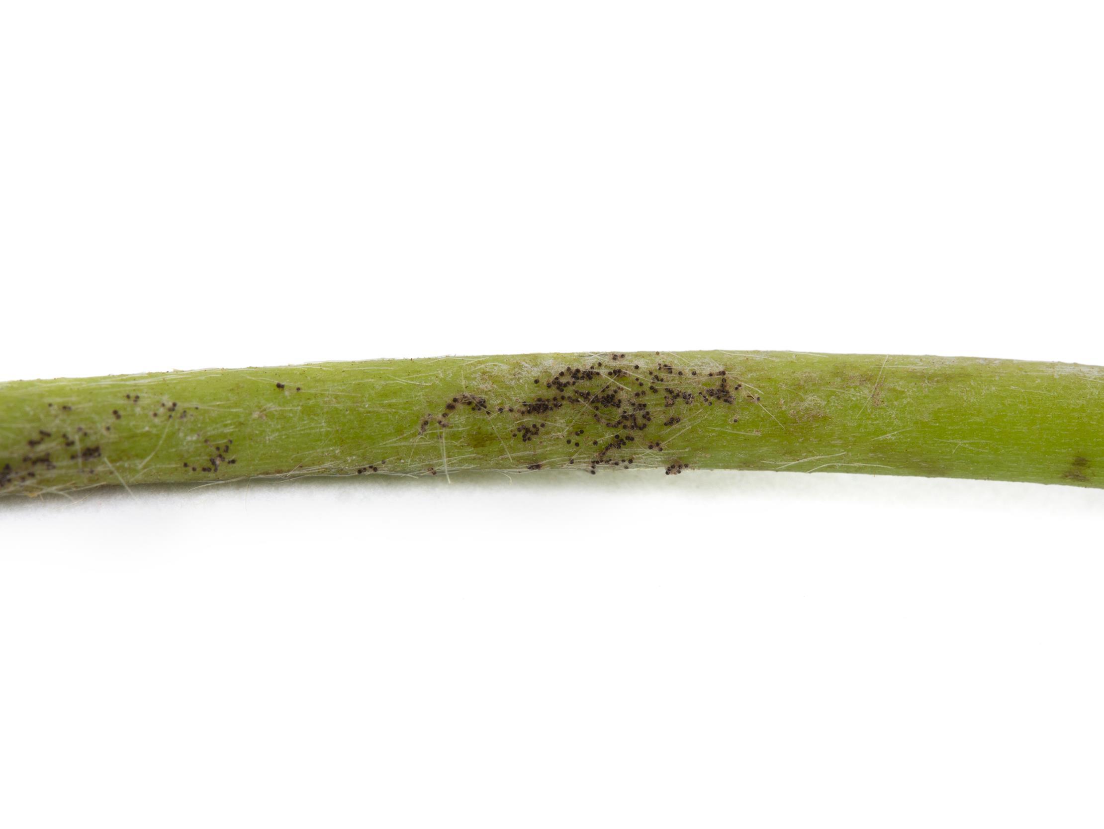 Légende: Duvet blanc (mycélium) et structures fongiques noires (cléistothèces) sur le pédoncule d’un fraisier.