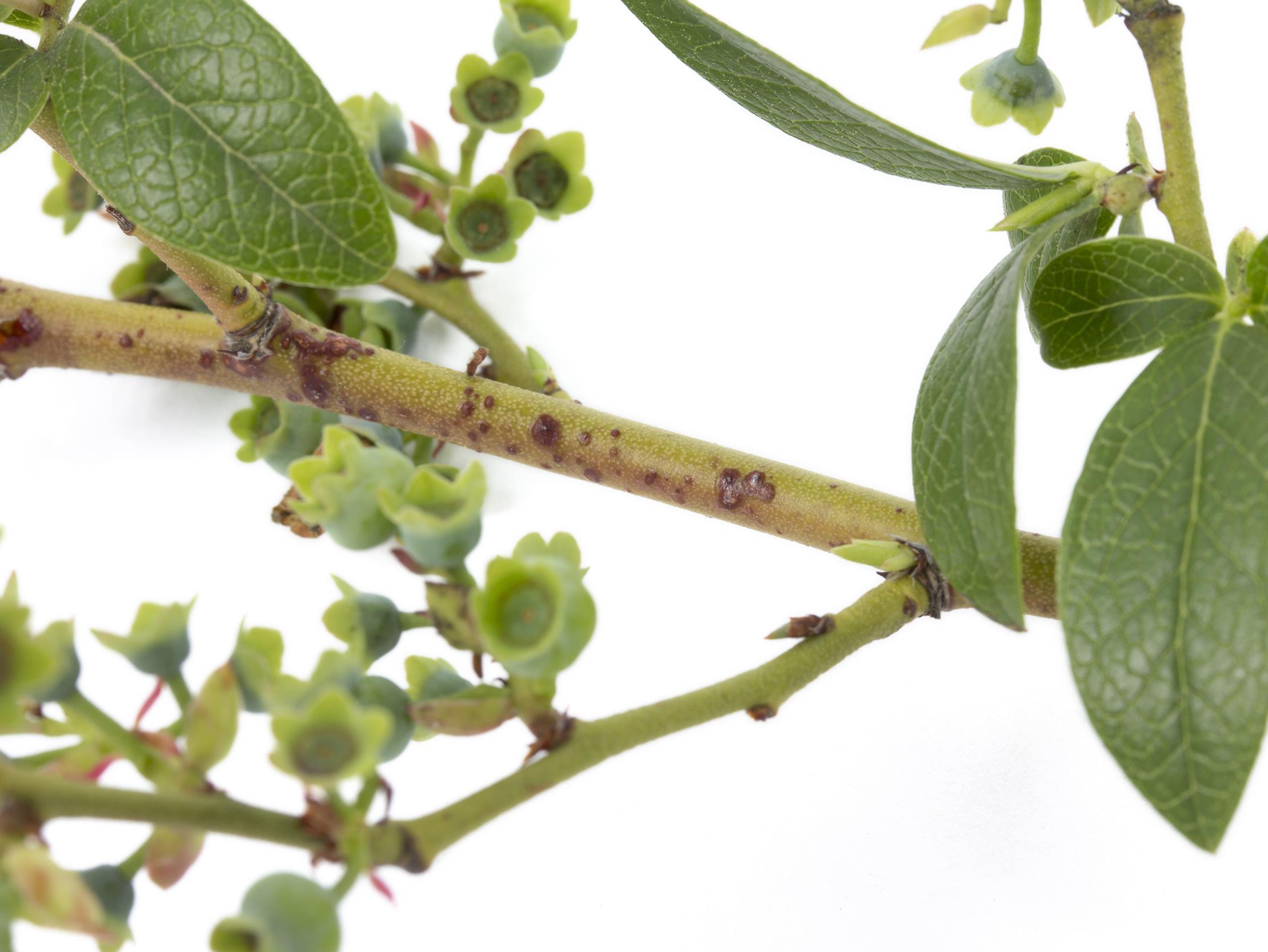 Légende: Taches rouges une tige de bleuetier en corymbe.