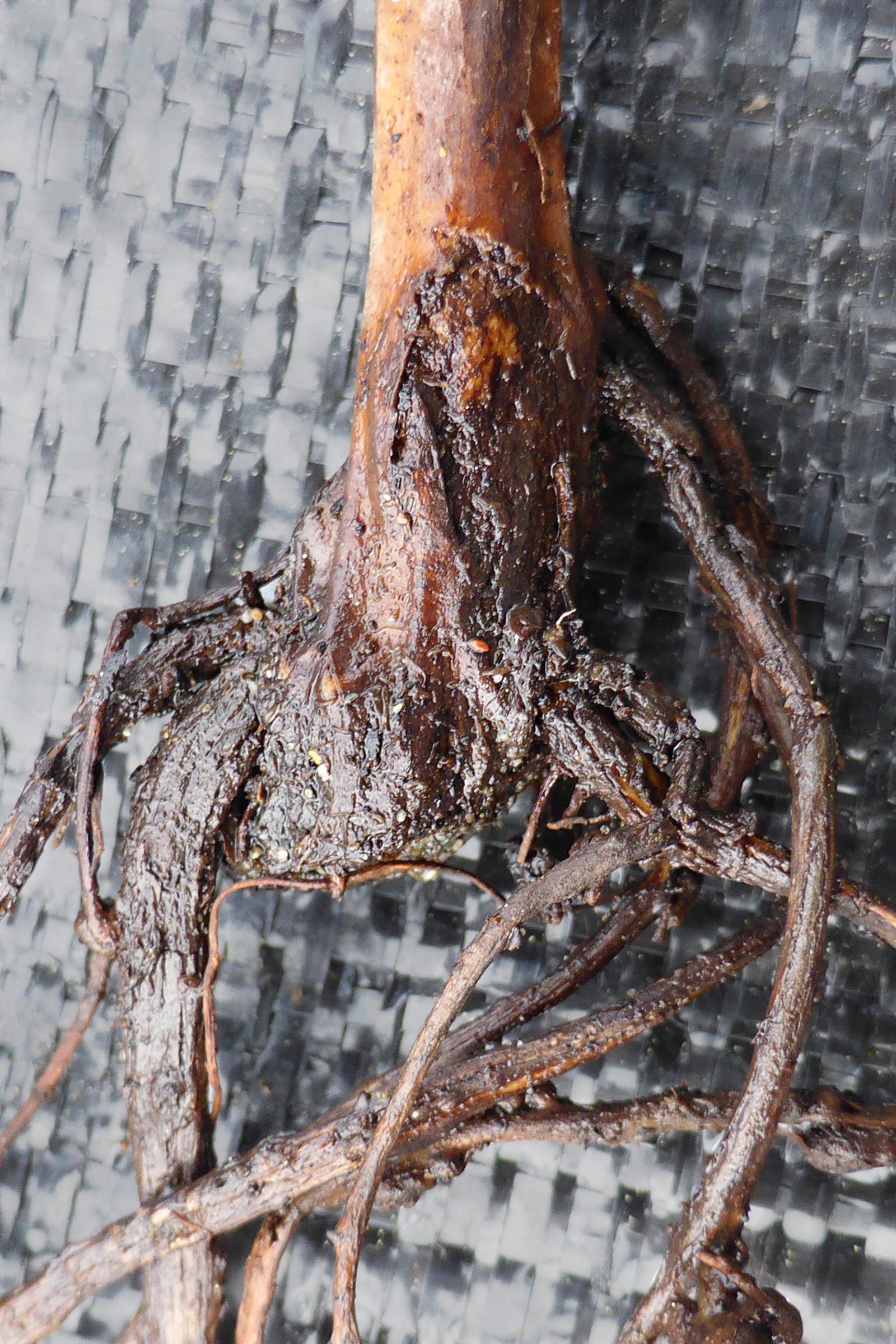 : Coloration noir et aspect viqueuse des racines et du collet. Les pourritures sont causées par un complexe de champignons phytopathogène.