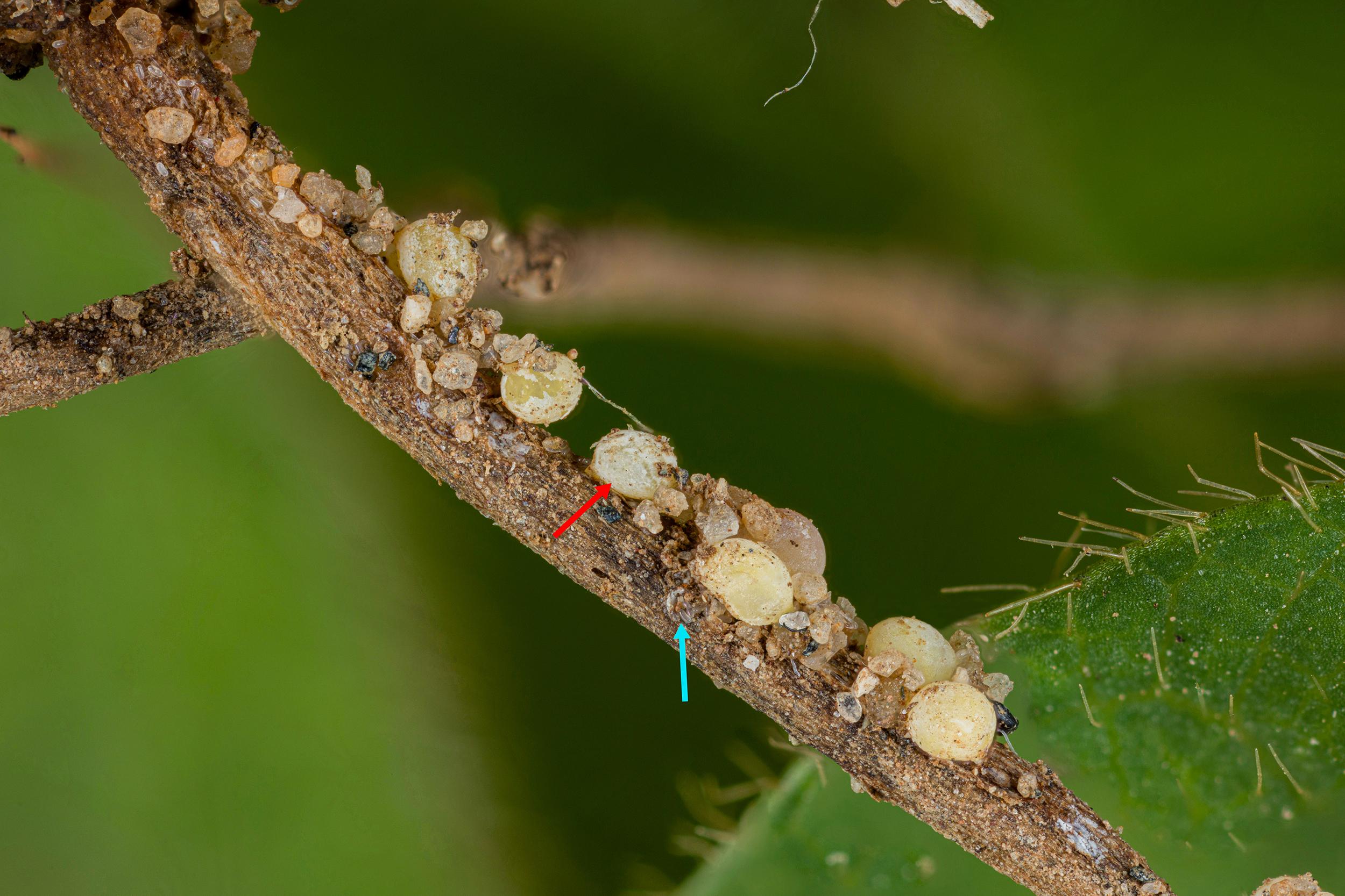 Description: La flèche rouge pointe un kyste de NKS alors que la flèche bleue pointe un oeuf translucide qui contient une larve au premier stade larvaire (J1).