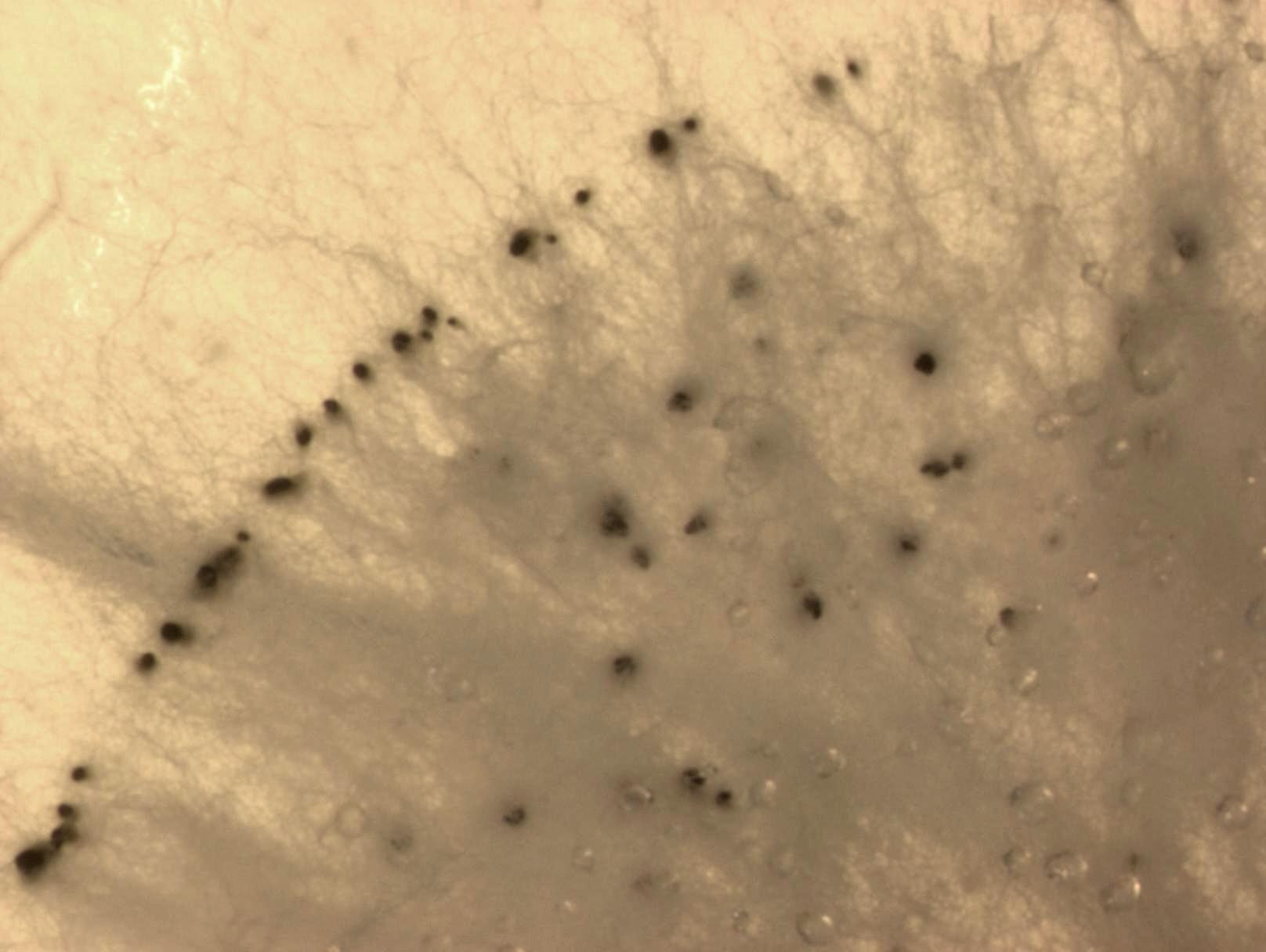 : Croissance mycélienne et acervules noires de Pestalotiopsis sp. sur un milieu de culture gélosé (Stéréomicroscope)