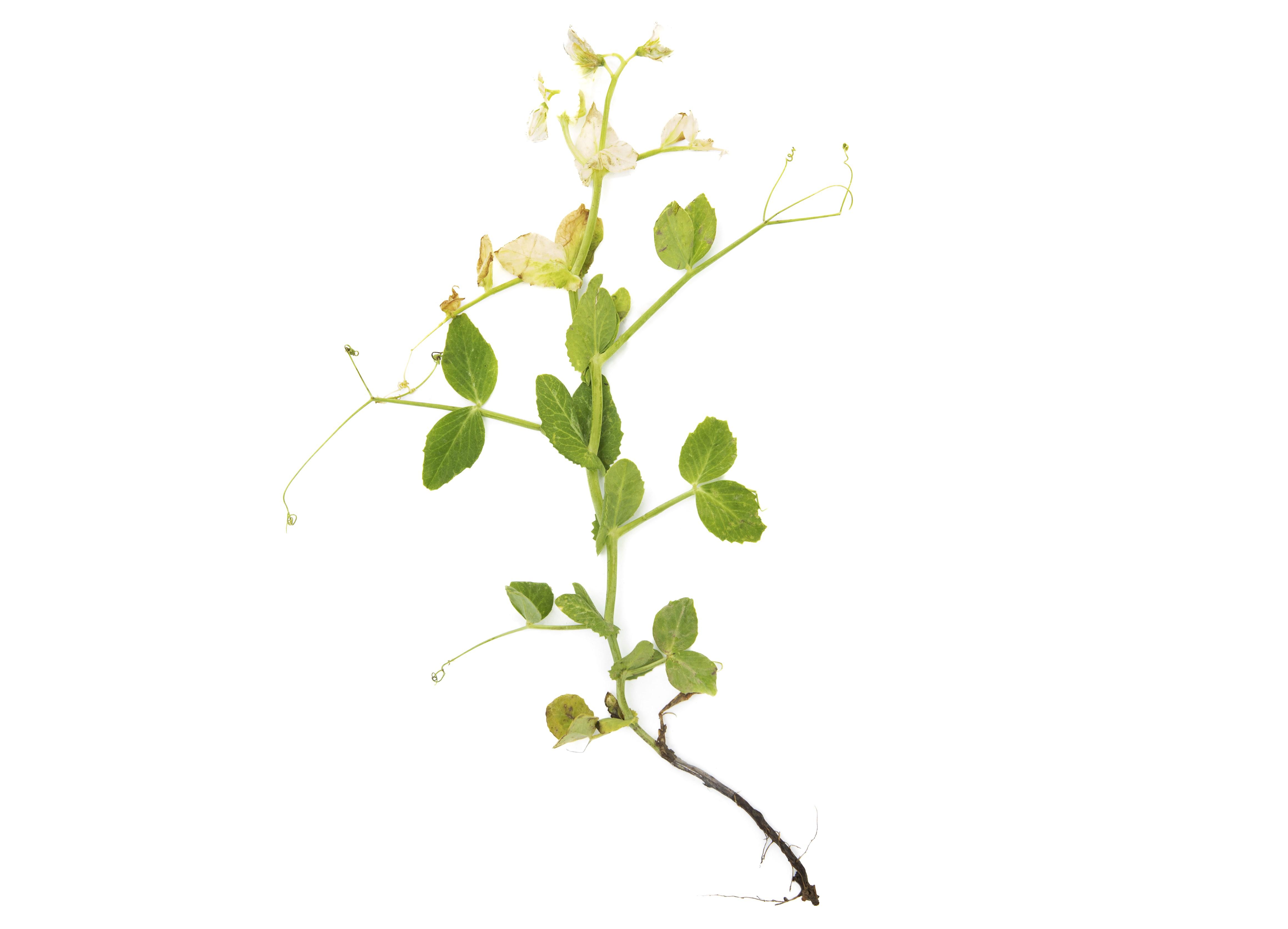 Légende: Jaunissement à blanchiment et brûlures sur feuilles de pois
