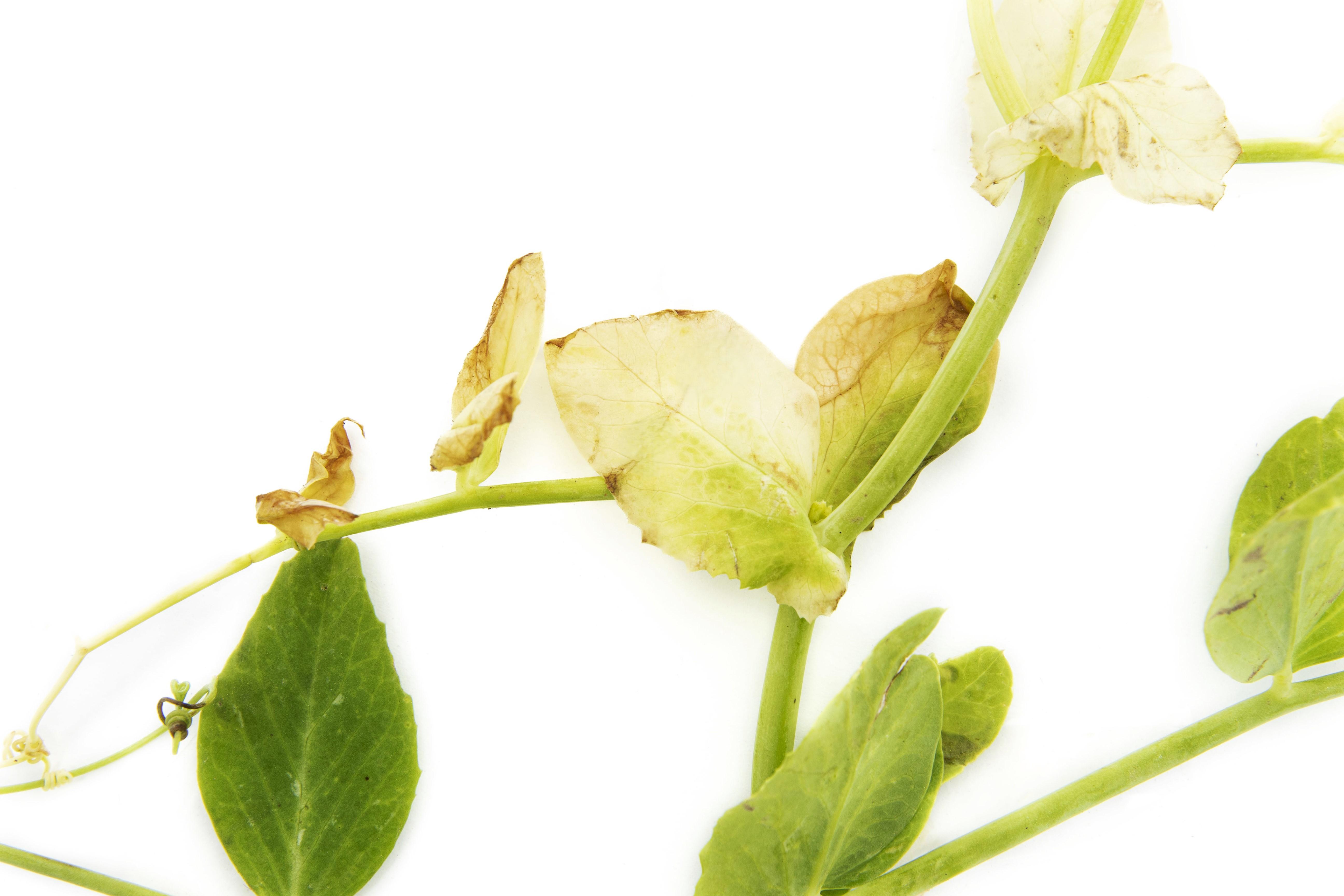 Légende: Jaunissement à blanchiment et brûlures sur feuilles de pois