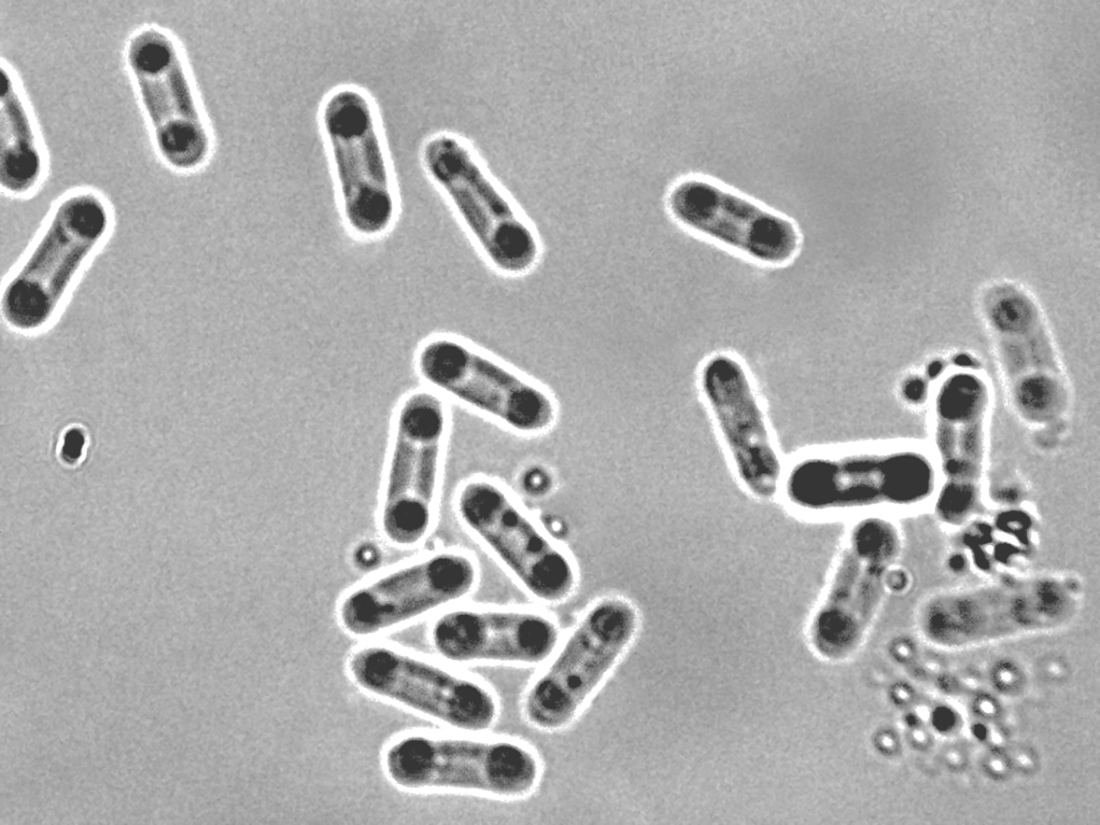 : Conidies (guttulées aux deux extrémités) de Zythia sp. (les guttules réfractent la lumière) (x 200)