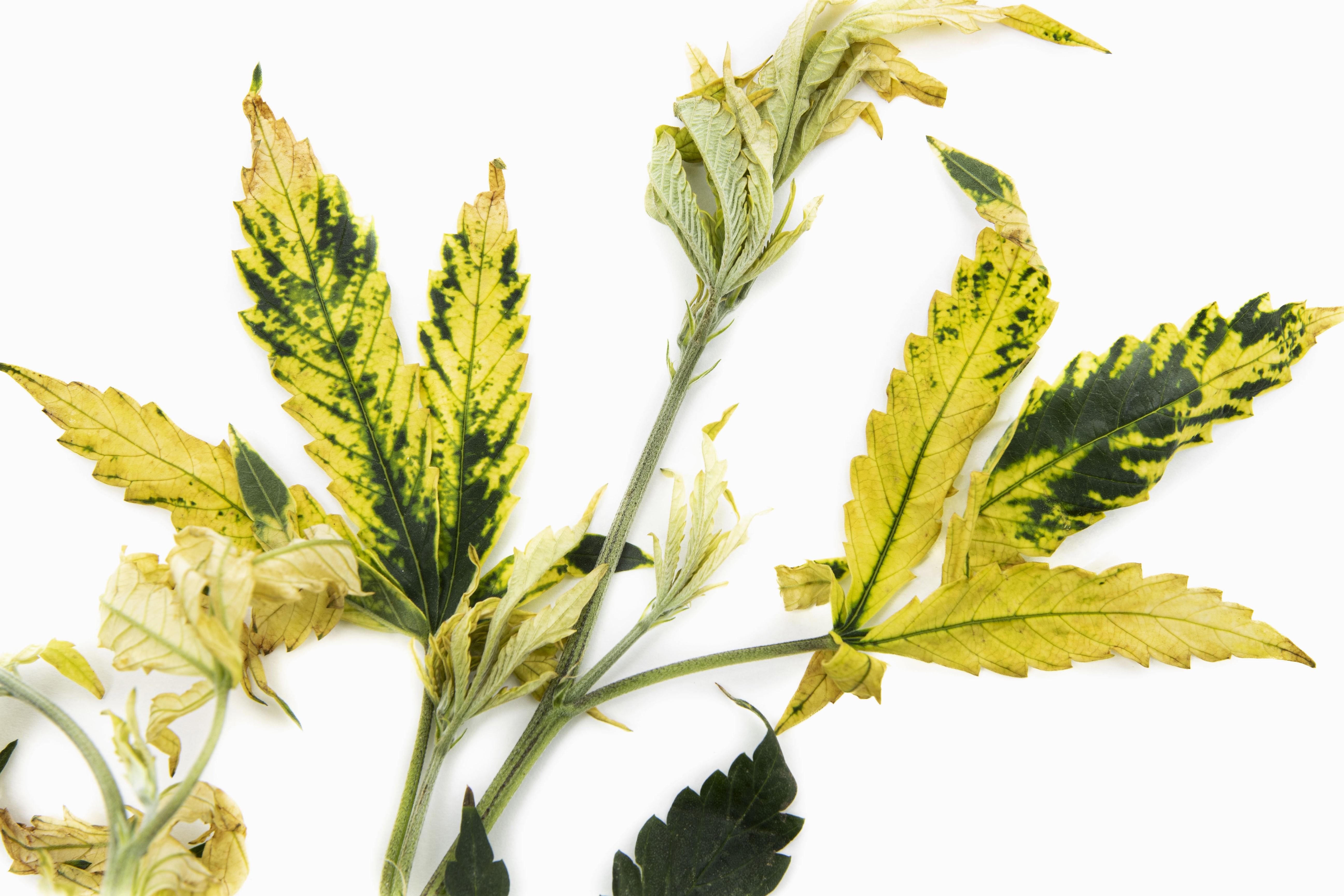 Légende: Jaunissement à blanchiment et brûlure sur feuilles de cannabis