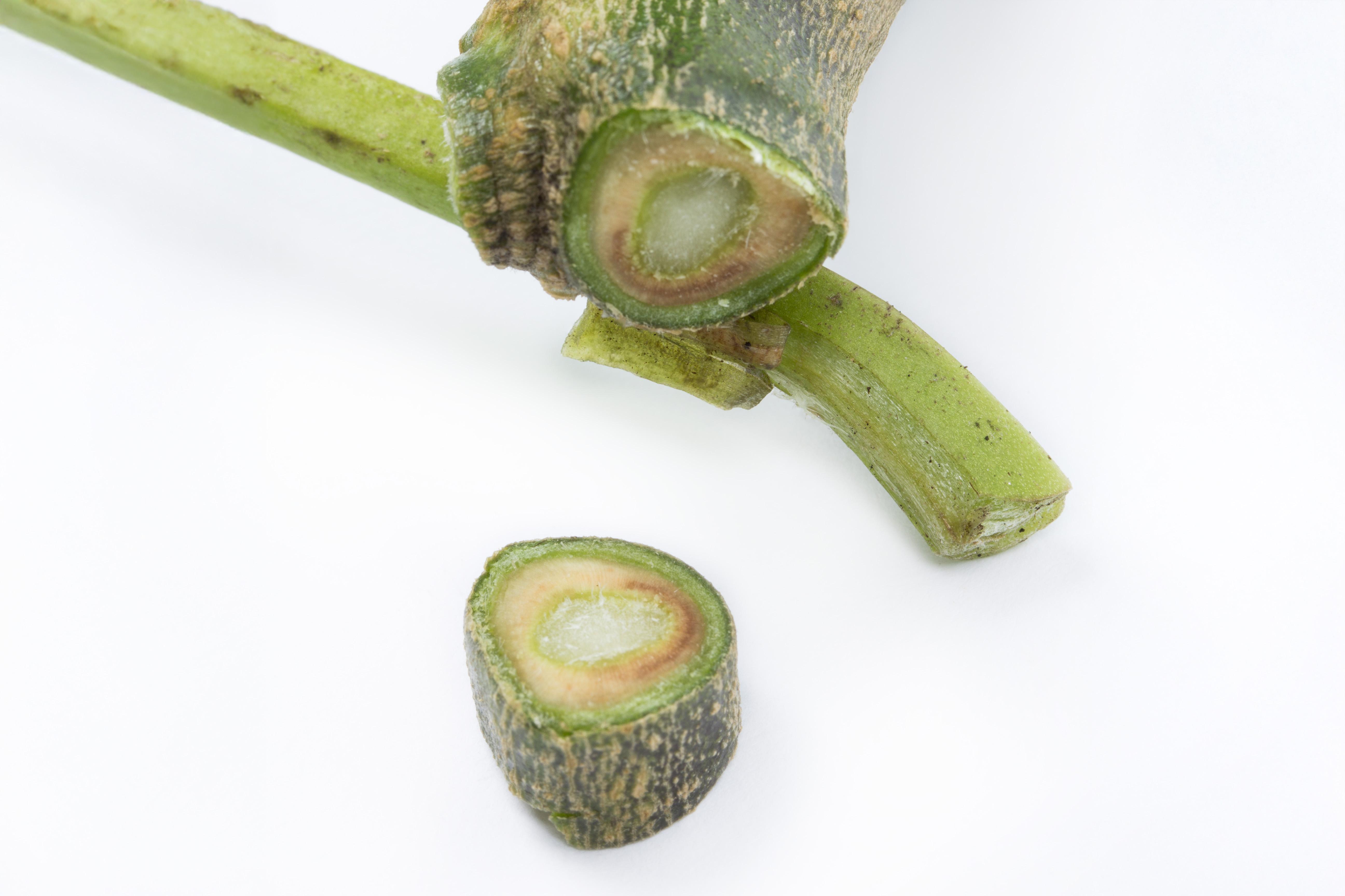 Description: Le collet d’un plant d’aubergine montre un brunissement localisé du système vasculaire. Les feuilles étaient jaunes puis devenaient brunes sur un seul côté du limbe (non visible ici). Les tests de laboratoire ont révélé dans le collet la présence du champignon Verticillium sp., responsable de la verticilliose. Il s’agit probablement de V. dahliae. Ce champignon est également responsable des symptômes observés sur les feuilles.