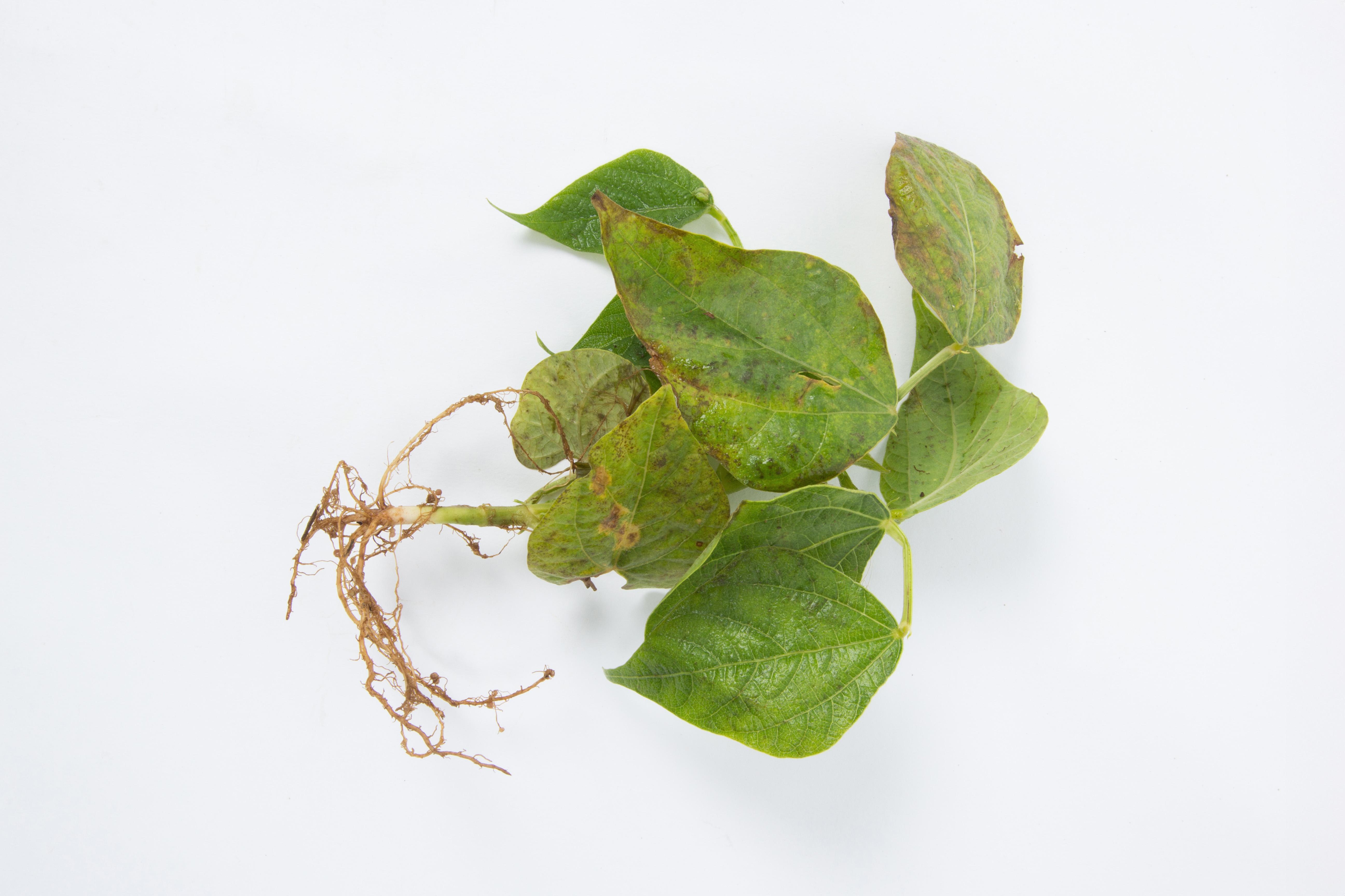 Description: Un plant de haricot montre des taches à contour diffus, beiges avec une marge brune, à la face supérieure des feuilles basales et médianes. Un halo jaune est parfois présent. Les taches sont surtout localisées à la marge. Les feuilles portant des taches sont aussi finement ponctuées et jaunies. Les taches sont moins visibles sur la face inférieure des feuilles. Les tests de laboratoire ont révélé la présence de la bactérie Pseudomonas syringae. Il s’agit probablement de P. s. pv. syringae, responsable de la graisse bactérienne (tache brune bactérienne) chez le haricot puisque les taches ne débutent pas à la face inférieure.
