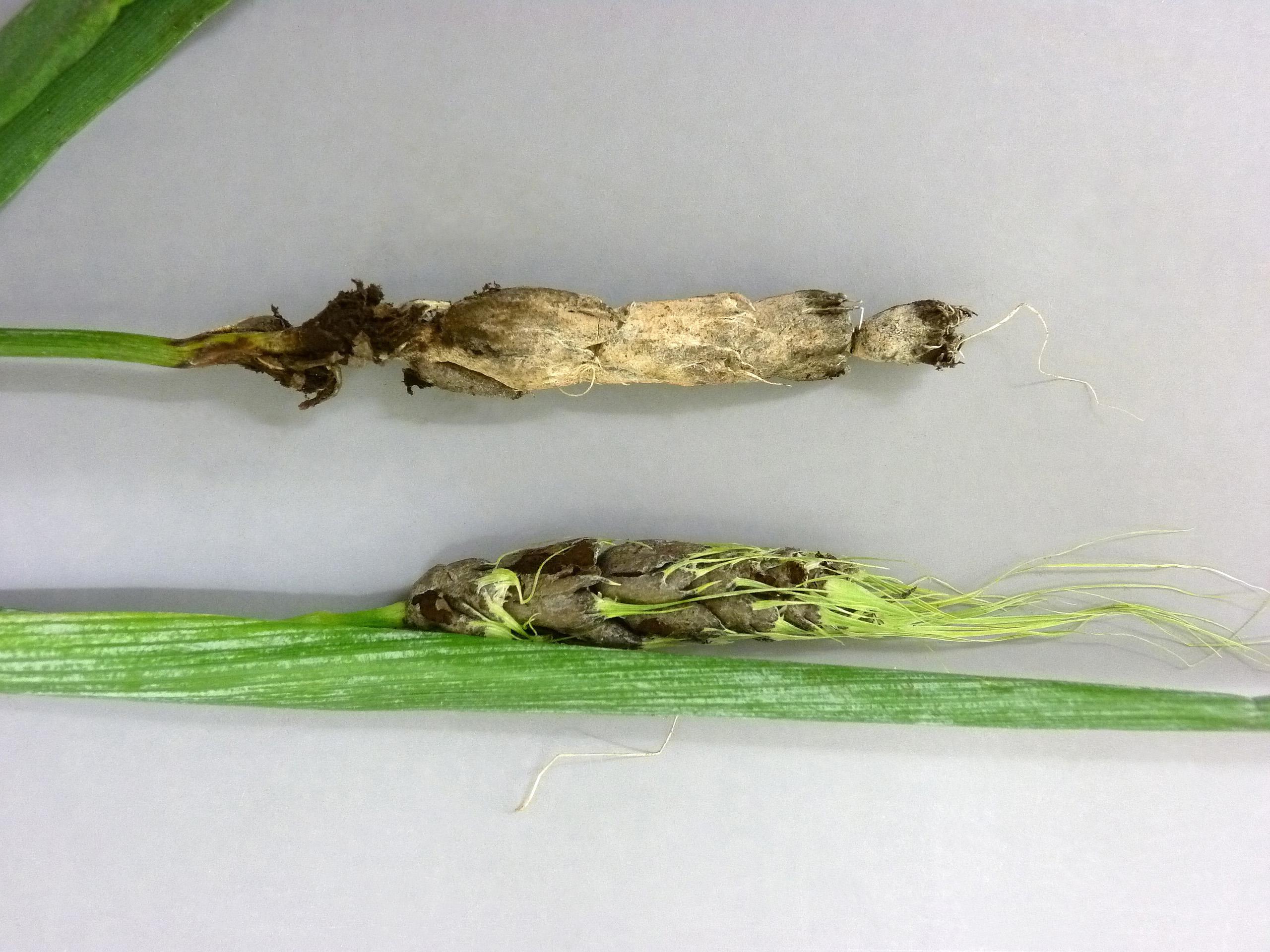 Description: Sur ces épis d’orge (cv 'Cyane'), la majorité des grains sont détruits et remplacés par des masses de spores brun grisâtre couvertes d’une membrane. Notez que sur l'épi de droite, les spores sont dénudées et prennent un aspect poudreux brun foncé. Les observations microscopiques ont révélé la présence de téliospores caractéristiques du champignon Ustilago hordei, responsable du charbon vêtu.