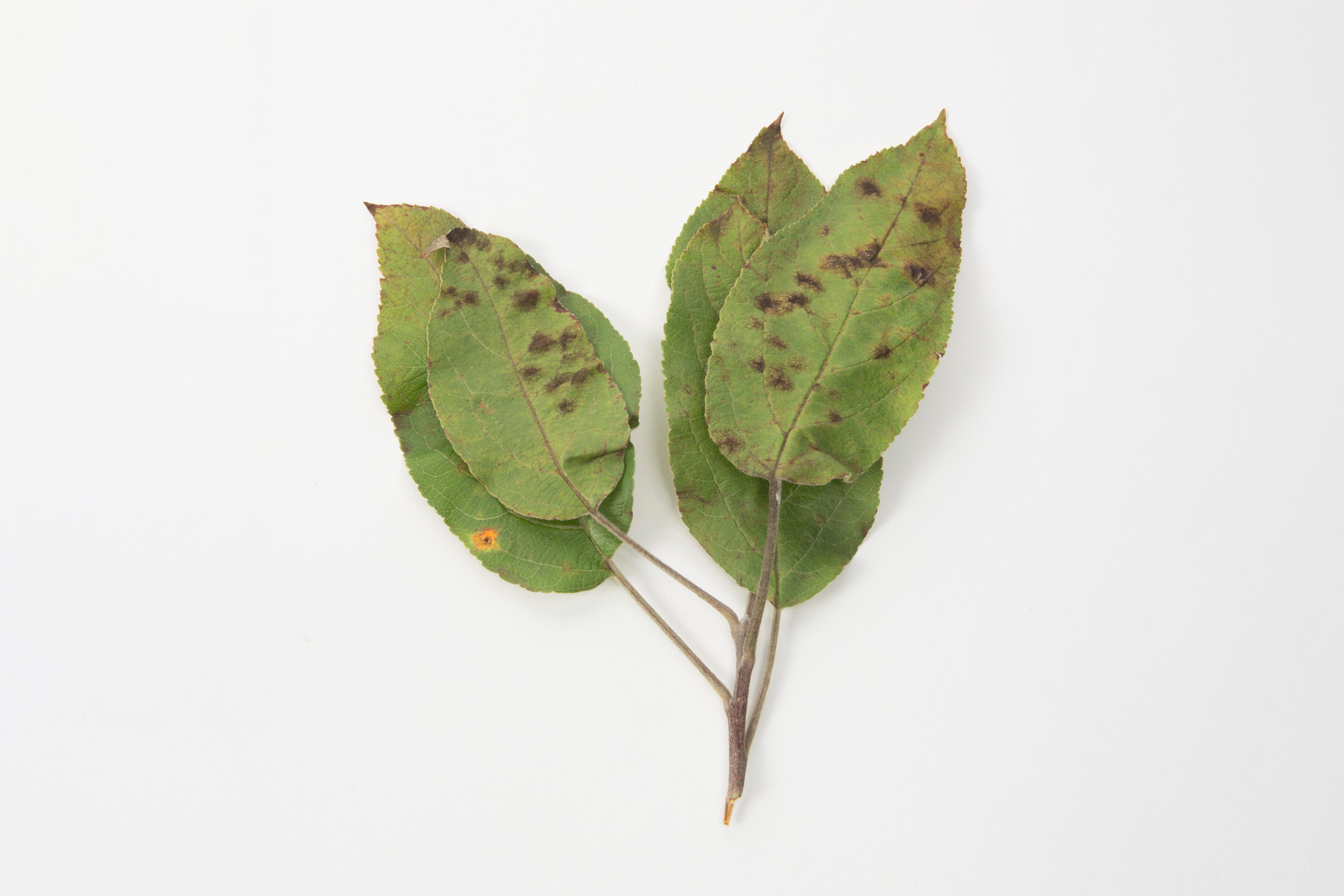 Description: Des feuilles de pommier montrent des taches brunes à vert olive avec une marge diffuse. Les taches sont distribuées aléatoirement sur le limbe à la face supérieure. Les observations microscopiques ont révélé la présence du champignon Spilocaea pomi, responsable de la tavelure.
