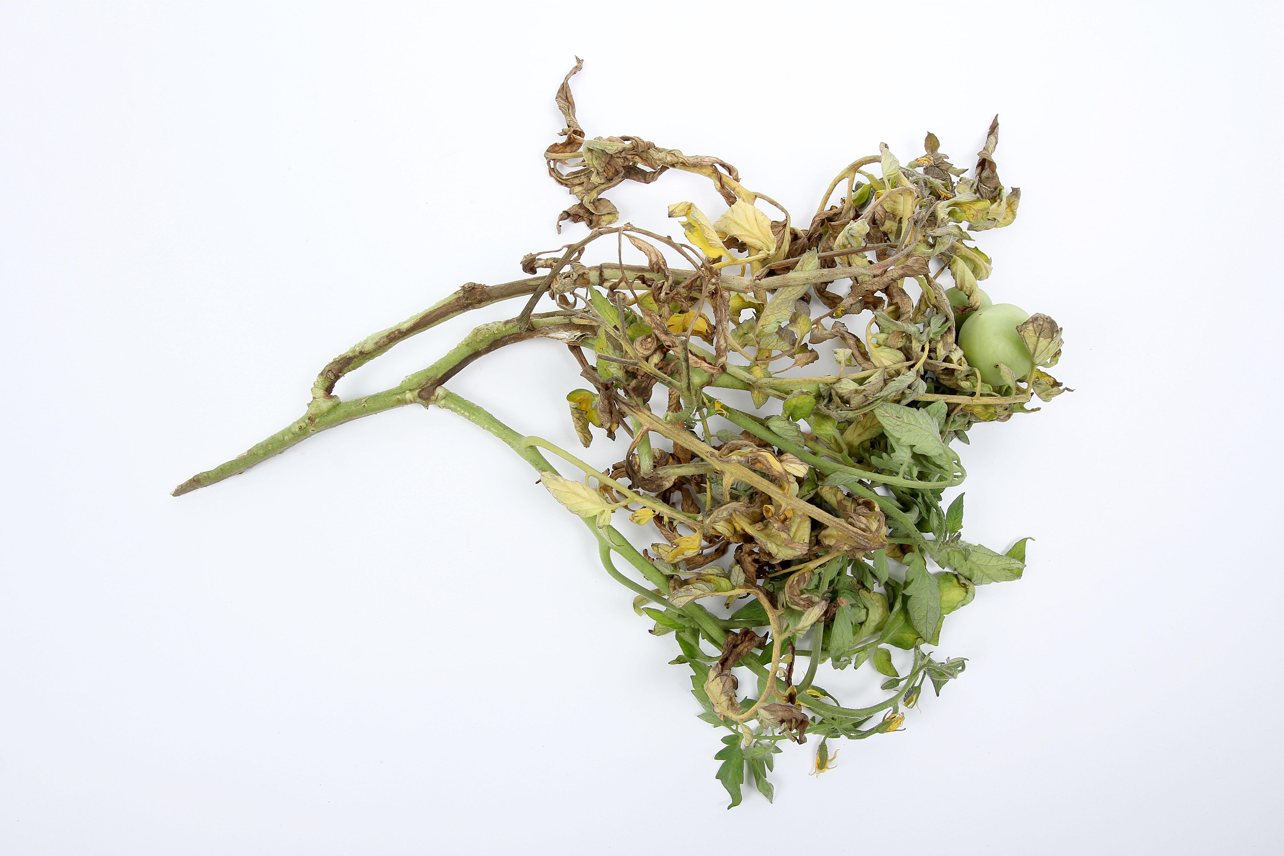 Description: Des tiges de tomate de champ portent des racines adventives et des chancres brun pâle à noirs dans lesquels les tissus s'affaissent. Les feuilles localisées dans les zones supérieures aux chancres sont jaunes, flétries et d’aspect brûlé. Les tests de laboratoire ont révélé la présence de la bactérie Pseudomonas corrugata, responsable de la moelle noire chez la tomate.