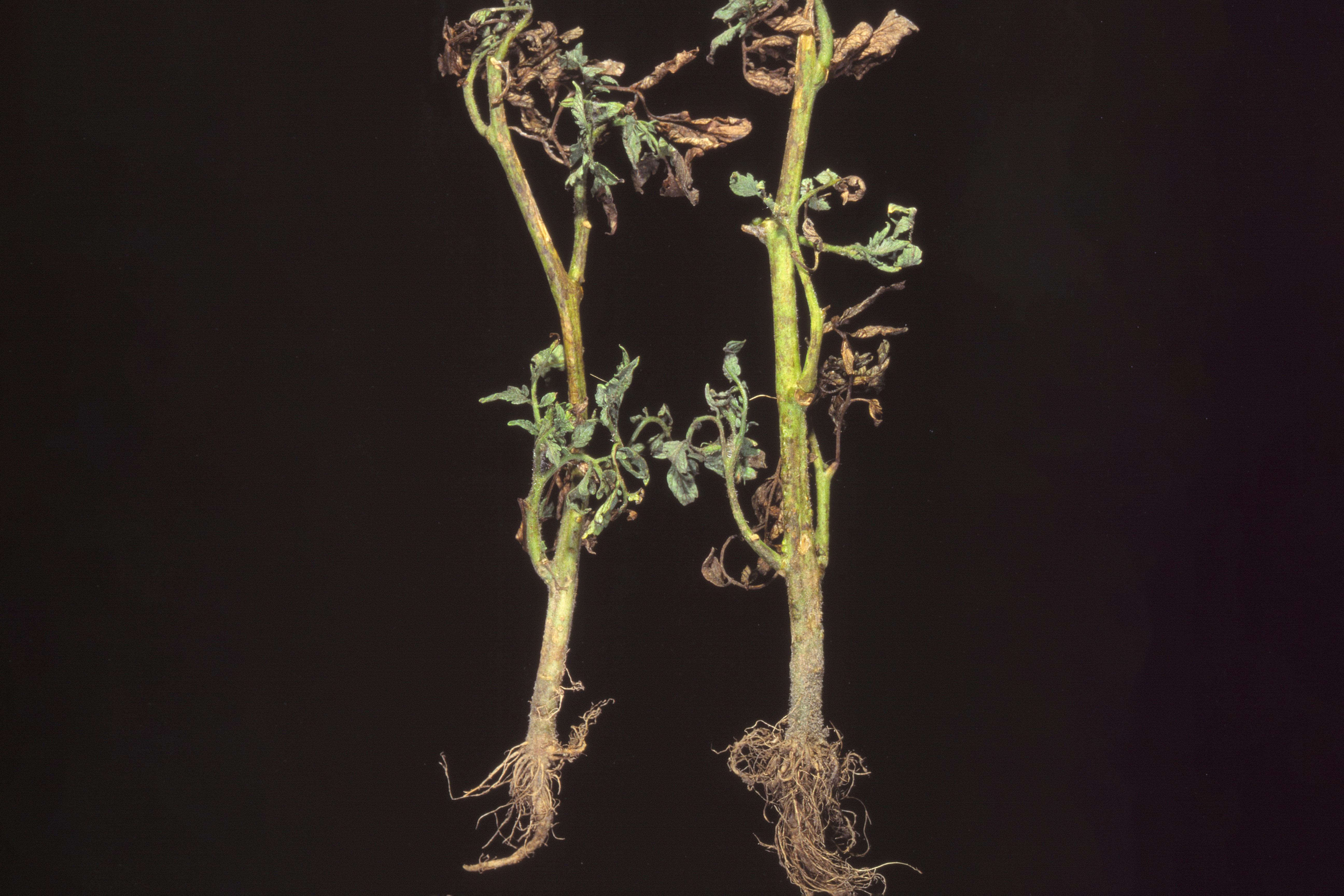 Description: Deux jeunes plants de tomate de serre montrent des brûlures entières de certaines feuilles tandis que d’autres demeurent vertes. Les feuilles s’enroulent vers le haut. Des primordia de racines adventives sont également visibles sur la tige (voir cercles). Le système vasculaire était fortement bruni (non visible ici). Les tests de laboratoire ont révélé la présence de la bactérie Ralstonia solanacearum, responsable du flétrissement bactérien des solanacées. Les plants provenaient de la Géorgie aux États-Unis.