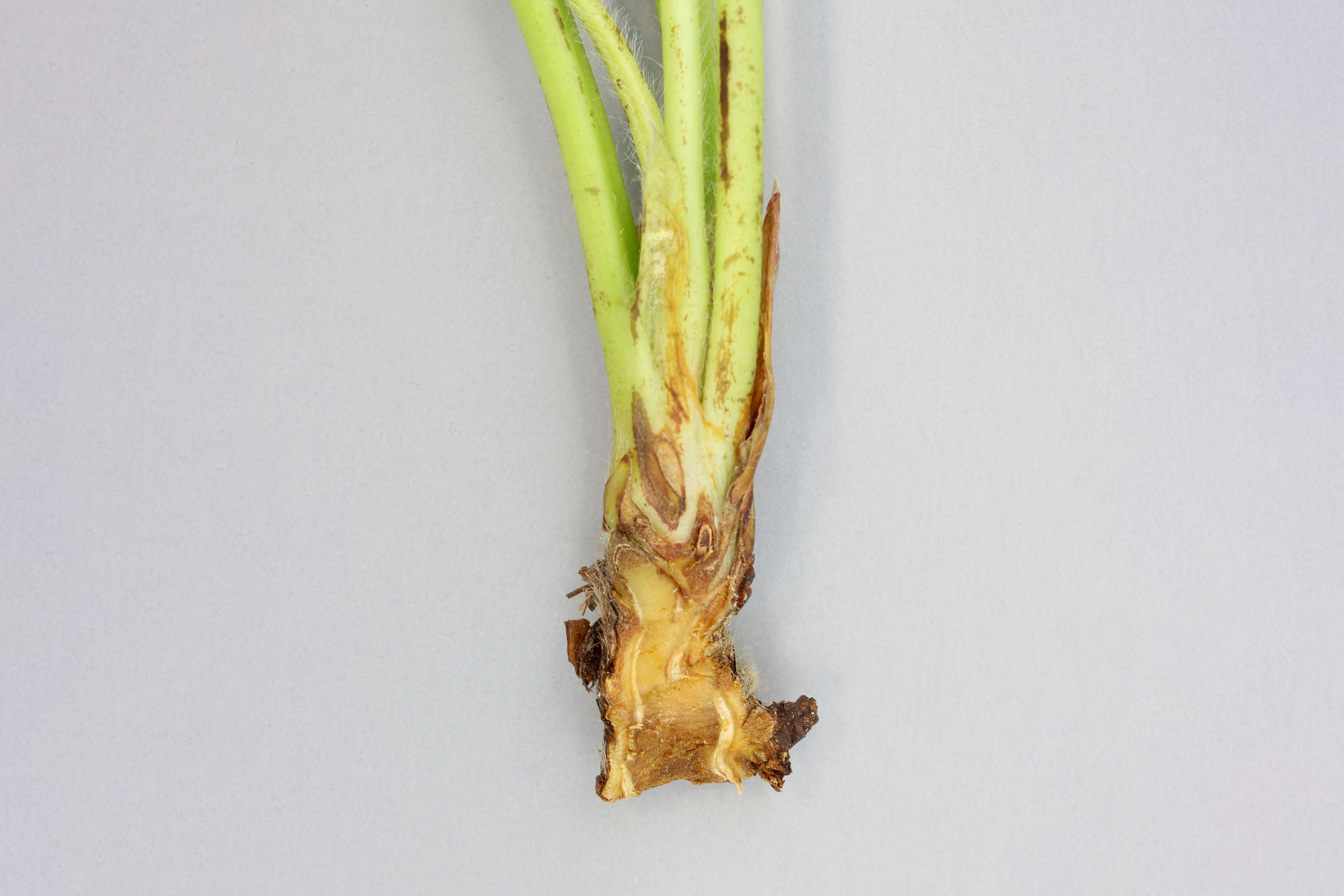 Description: Le collet de ce fraisier (cv 'Monterey') montre une moelle brune dans sa partie basale. Le système vasculaire est sans symptôme tout comme le feuillage. Les tests de laboratoire se sont avérés négatifs pour la détection des champignons, particulièrement pour Phytophthora dans le collet et les racines. Il est plausible de croire que ce plant a subi du gel hivernal léger.