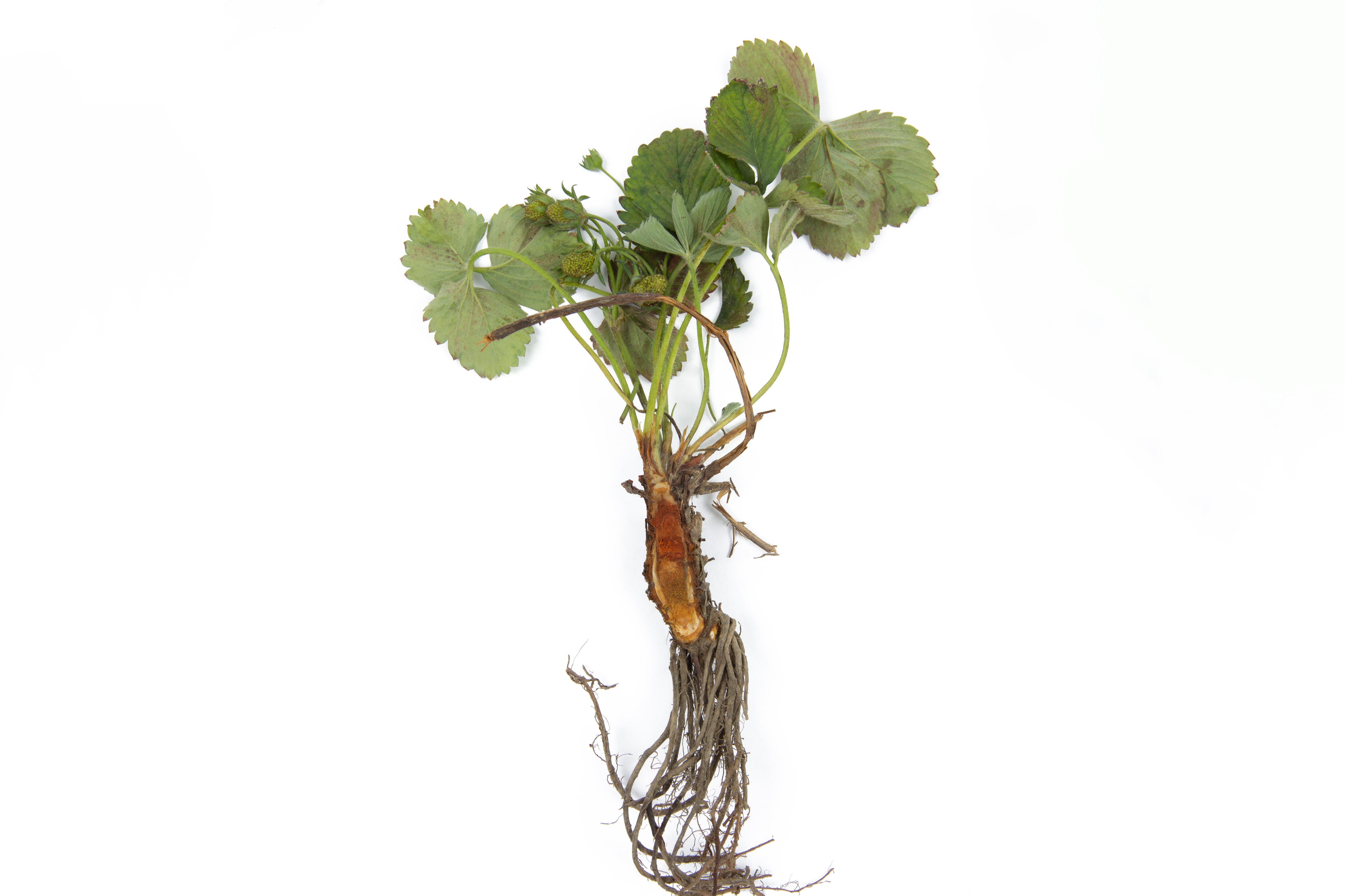 Description: À l’intérieur du collet de ce fraisier (cv 'Jewel'), on observe un rougissement et un brunissement intense dans les tissus internes. Puisque les tests de laboratoire n’ont détecté aucun agent pathogène causant ce type de symptôme, il est probable que ce plant ait subi du gel hivernal.