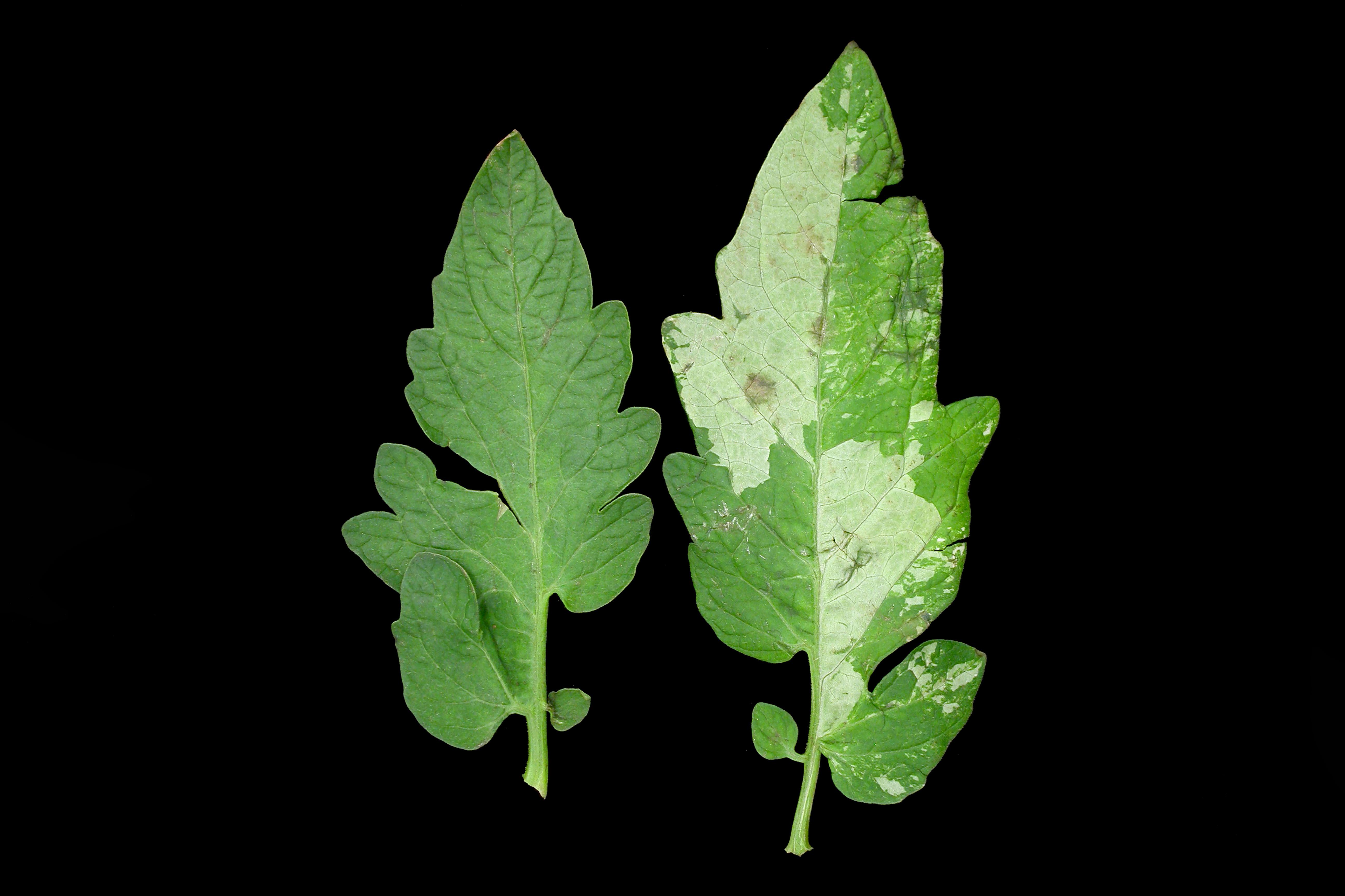 Légende: Comparaison entre une foliole de tomate saine et affectée