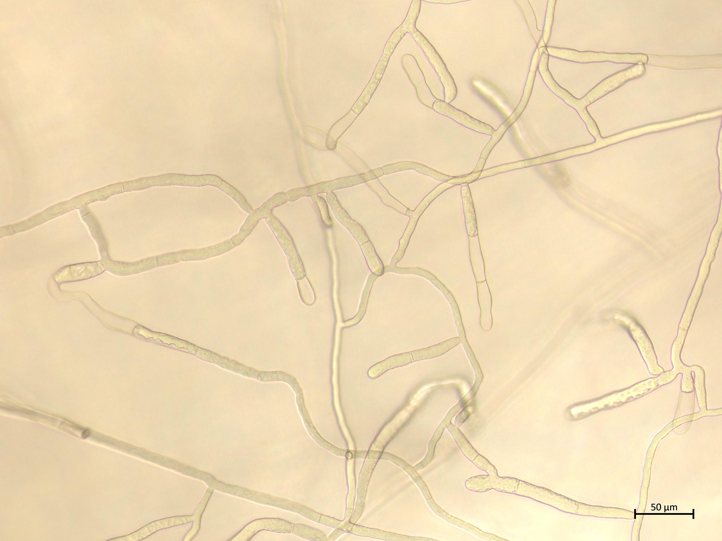 Légende: Mycélium caractéristique de Rhizoctonia solani.