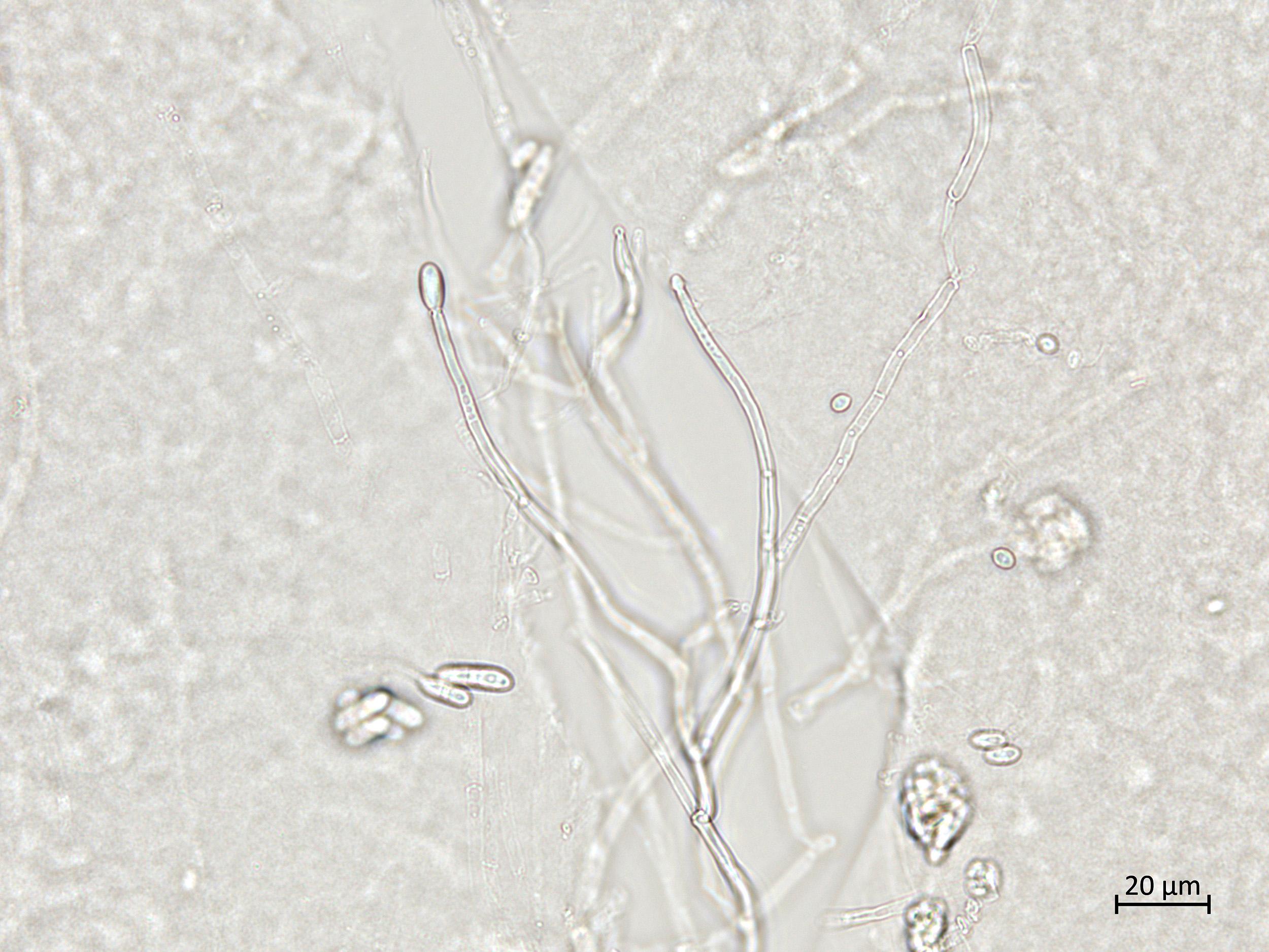 : Conidies en croissance aux extrémités des conidiophores d'Ilyonectria liriodendri.