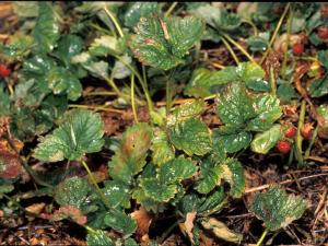 Les feuilles de fraisier (cv 'Cavendish') sont affectées par de nombreuses et minuscules taches blanchâtres à jaunâtres. Elles sont généralement plus nombreuses sur la moitié ...