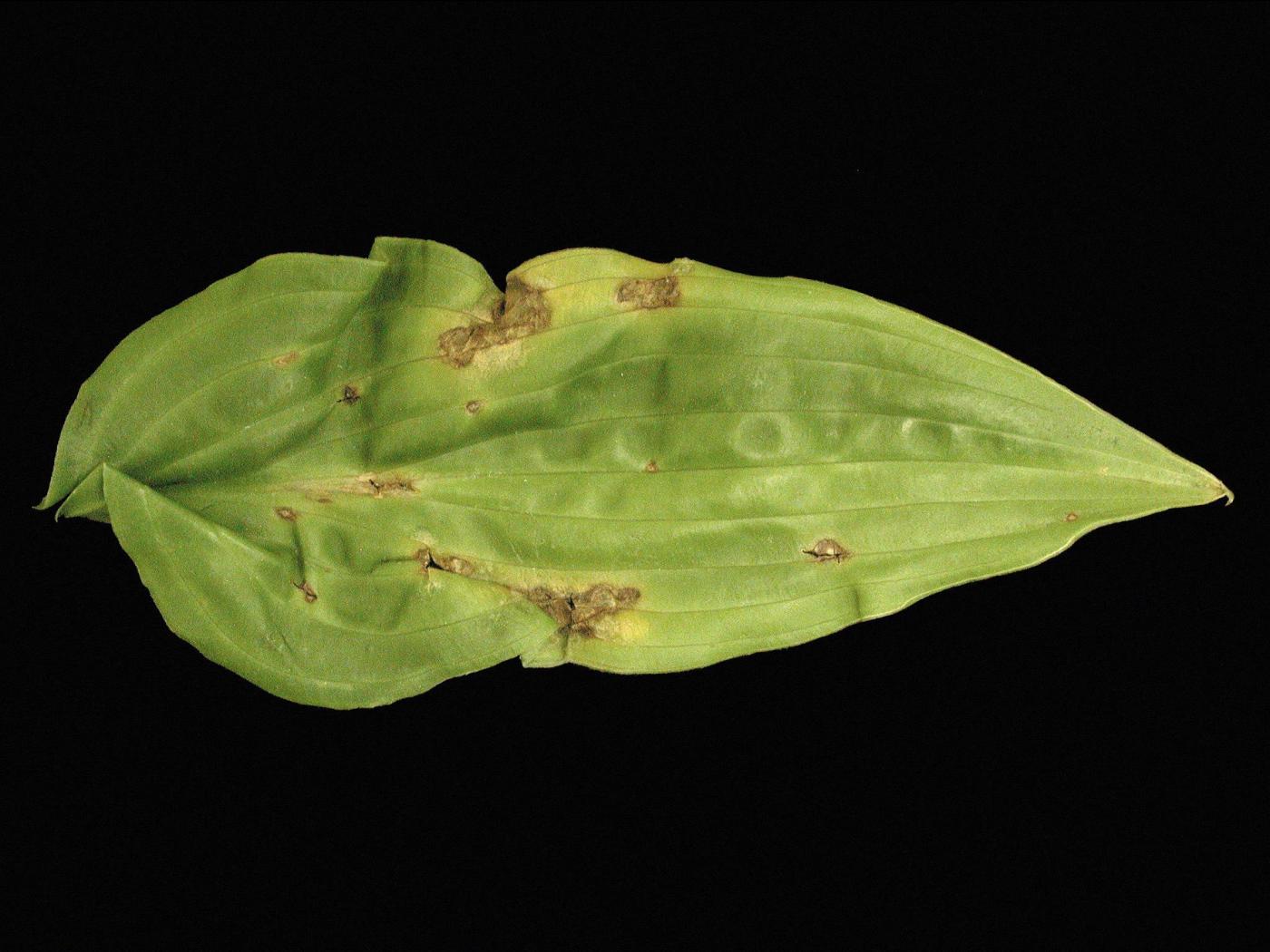 Légende: Taches et brûlures sur feuille d'hosta