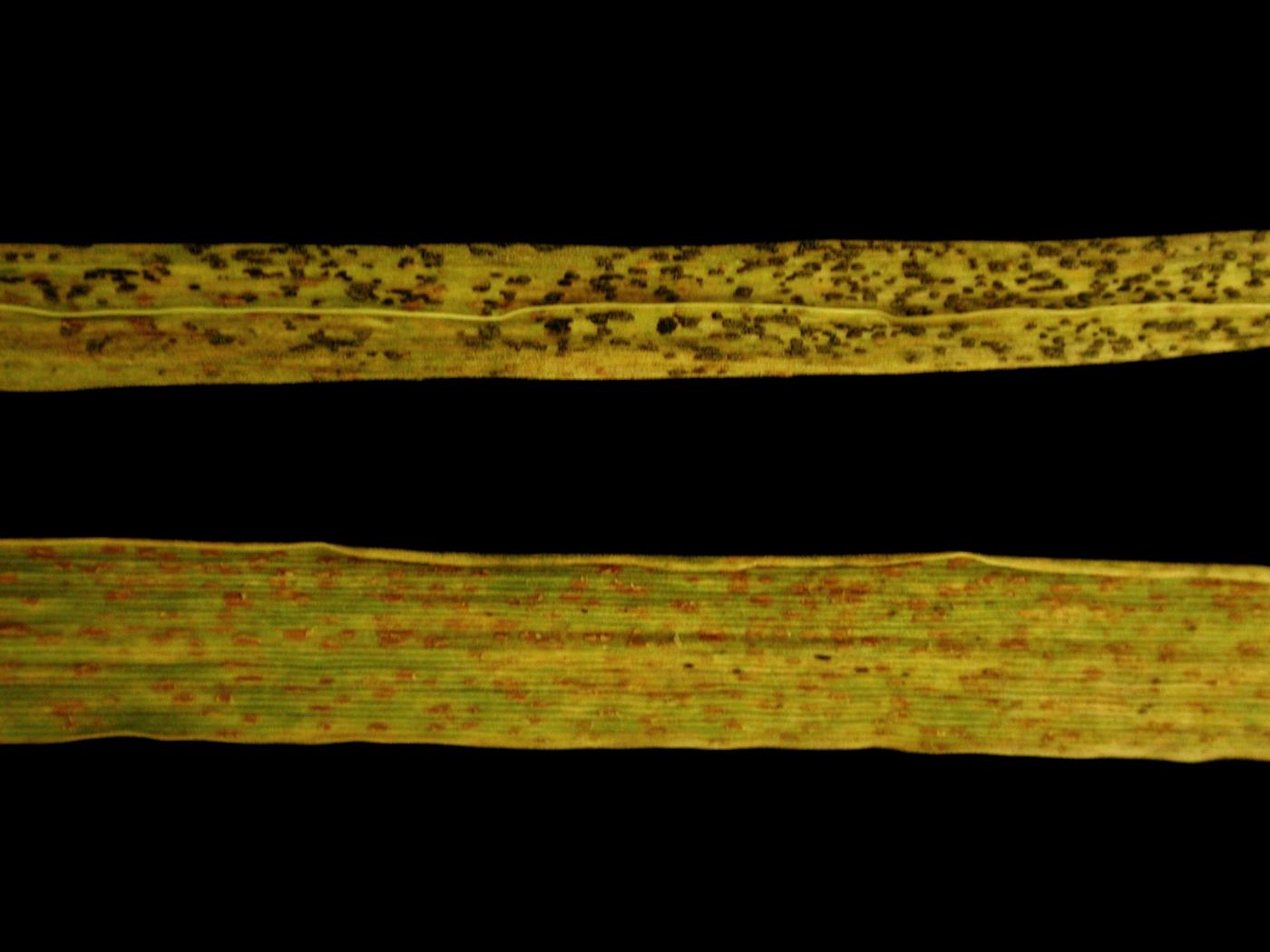 Description: Les feuilles de seigle d’automne (cv 'ACE-1') montrent deux stades différents de la maladie. Sur la feuille du bas, le premier stade de la maladie se manifeste par la présence de nombreuses petites pustules rondes rouge orangé à rouge brique. L’autre feuille montre le second stade qui s’exprime par des pustules noires. Les observations microscopiques ont confirmé la présence d’urédospores et de téliospores du champignon Puccinia triticina, responsable de la rouille des feuilles (rouille brune) c… En savoir plus