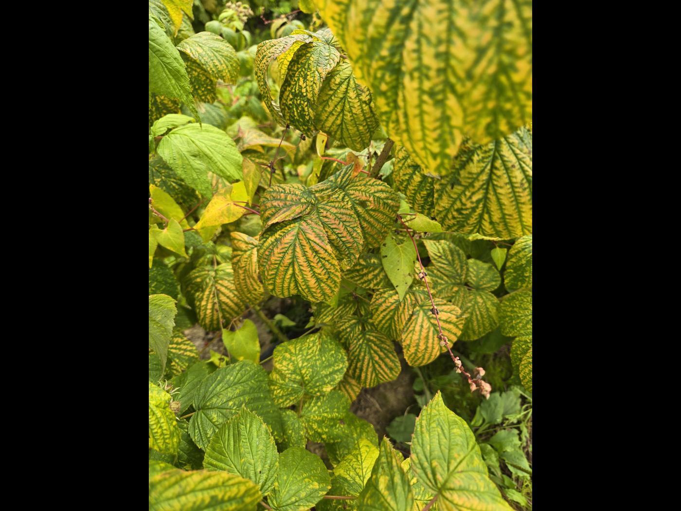 Description: Anomalie de coloration entre les nervures d'une feuille de framboisier.