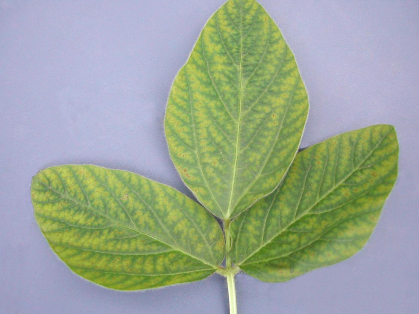 Feuille : coloration vert pâle à jaune du limbe entre les nervures qui demeurent vertes. Lorsque la carence est prononcée, le limbe devient blanchâtre, des taches brunes nécrotiques apparaissent entre les nervures et il peut y avoir une chute prématurée du feuillage. Les symptômes débutent sur les jeunes feuilles.