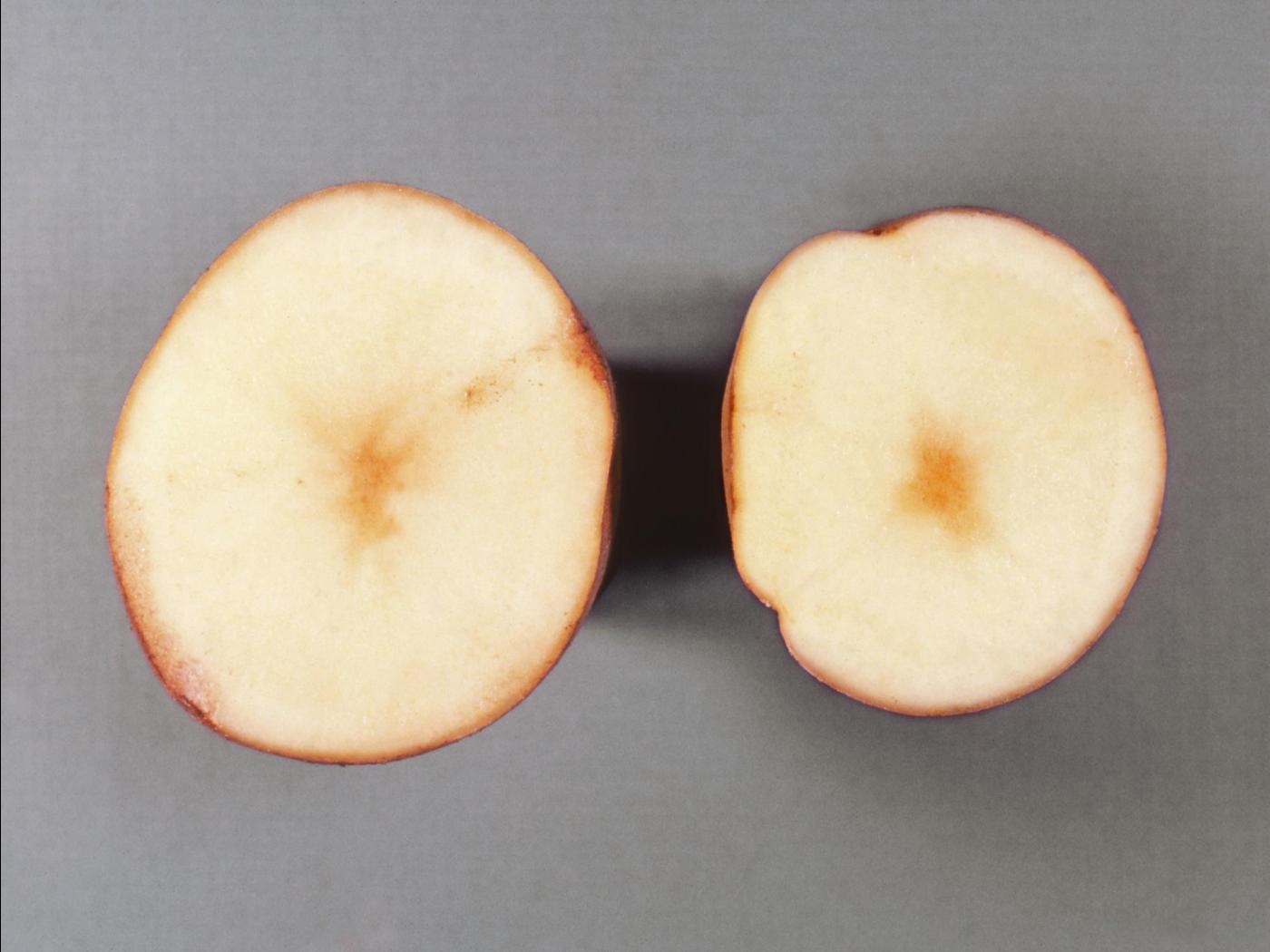 Tubercule : au centre de la chair, présence d’une coloration brun pâle à brun foncé, souvent d’aspect diffus. L’intensité de la coloration et la grandeur du cœur peuvent varier. Les cellules affectées meurent éventuellement. Sur les petits tubercules, le cœur brun peut disparaitre si la croissance est lente et uniforme durant sa maturation. Les cellules brunes se mélangent aux cellules saines et la couleur brune se dissipe avant la récolte.