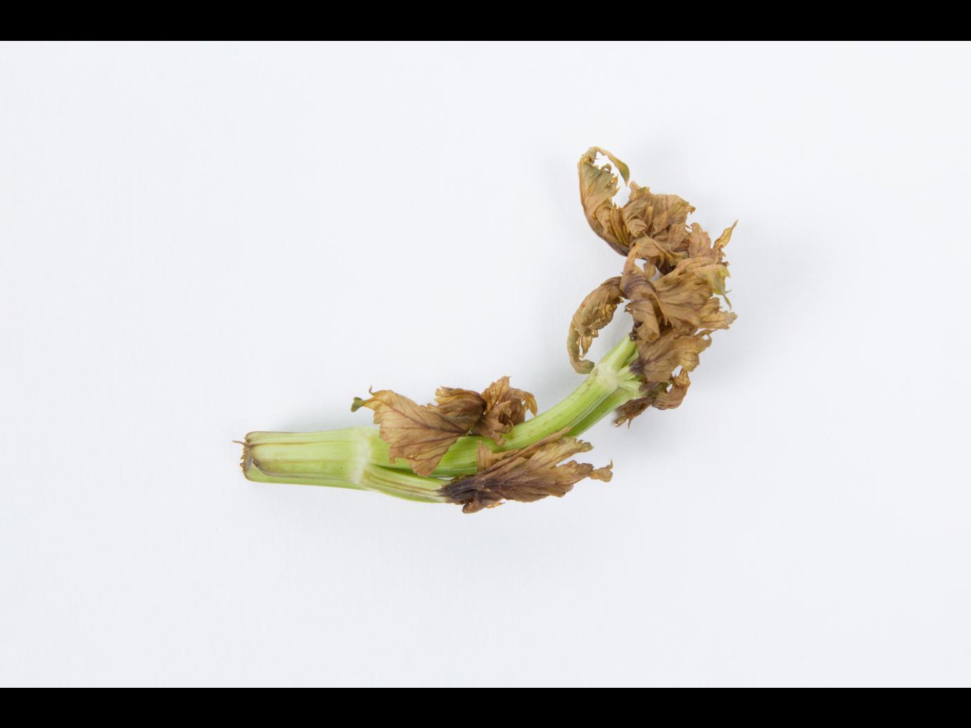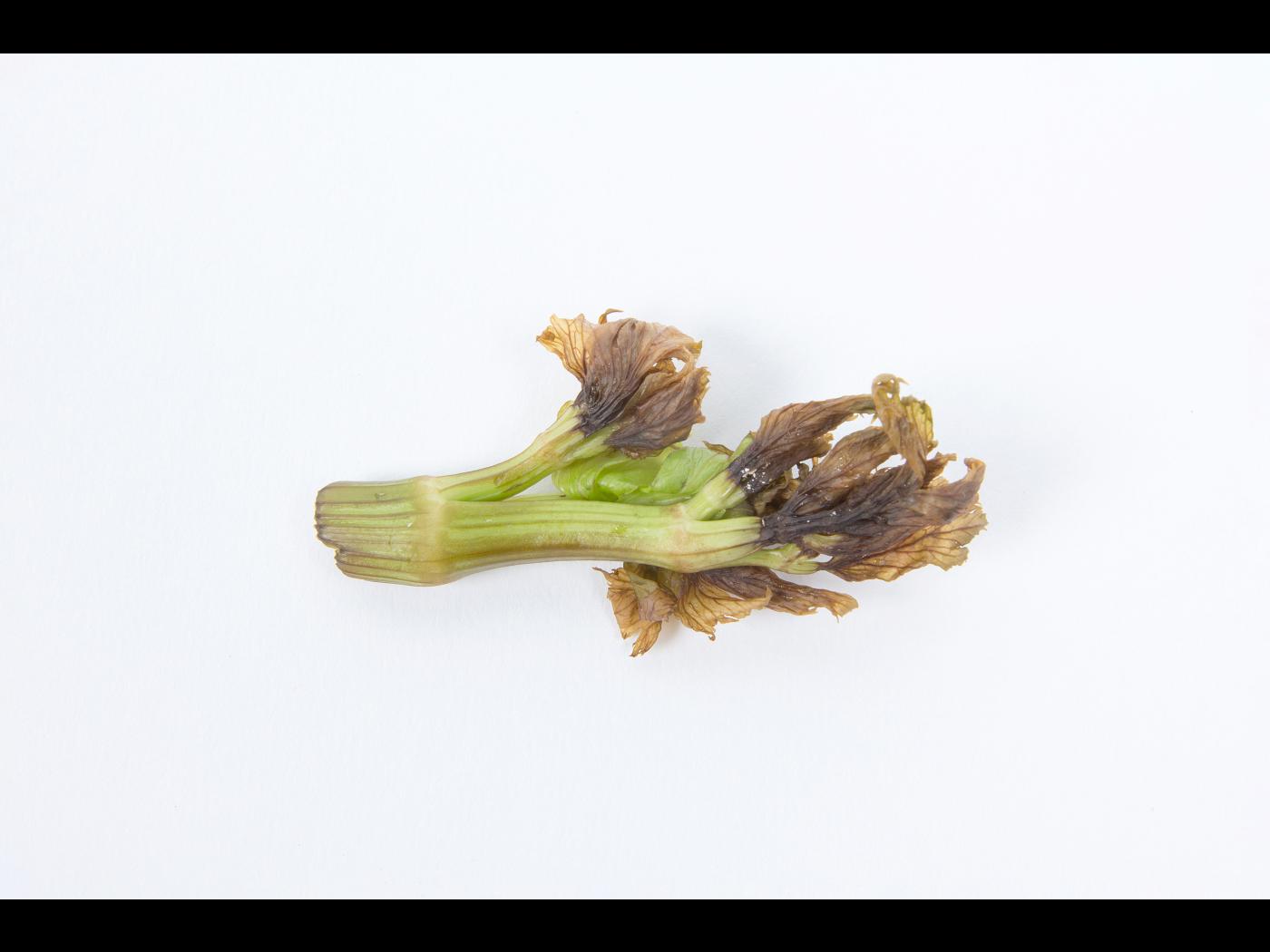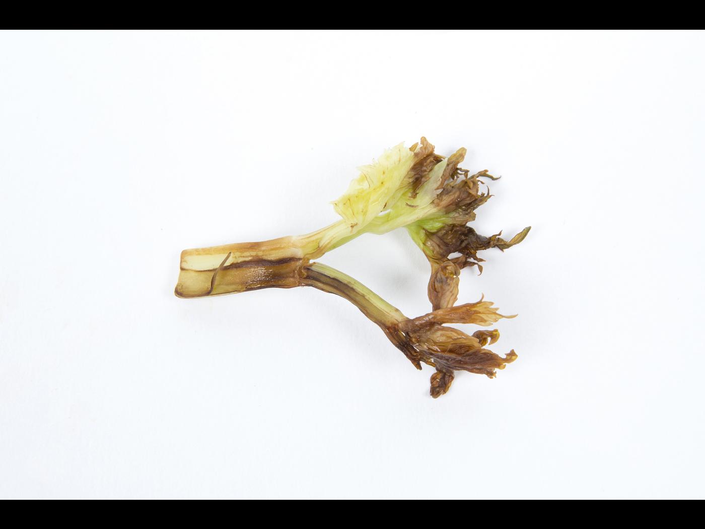 Description: Une vue rapprochée d’un morceau de pétiole de céleri provenant du cœur des plants montre une coloration brun-noir de l’extrémité des jeunes feuilles. Une délimitation nette sépare les tissus affectés des tissus d'apparence saine. Le pétiole est un peu tordu. Les tests de laboratoire se sont avérés négatifs pour la détection de champignon et de bactérie. Les dommages s’apparentent à ceux du cœur noir induit par une carence en calcium.   Le conseiller agricole mentionne que le céleri est cultivé s… En savoir plus