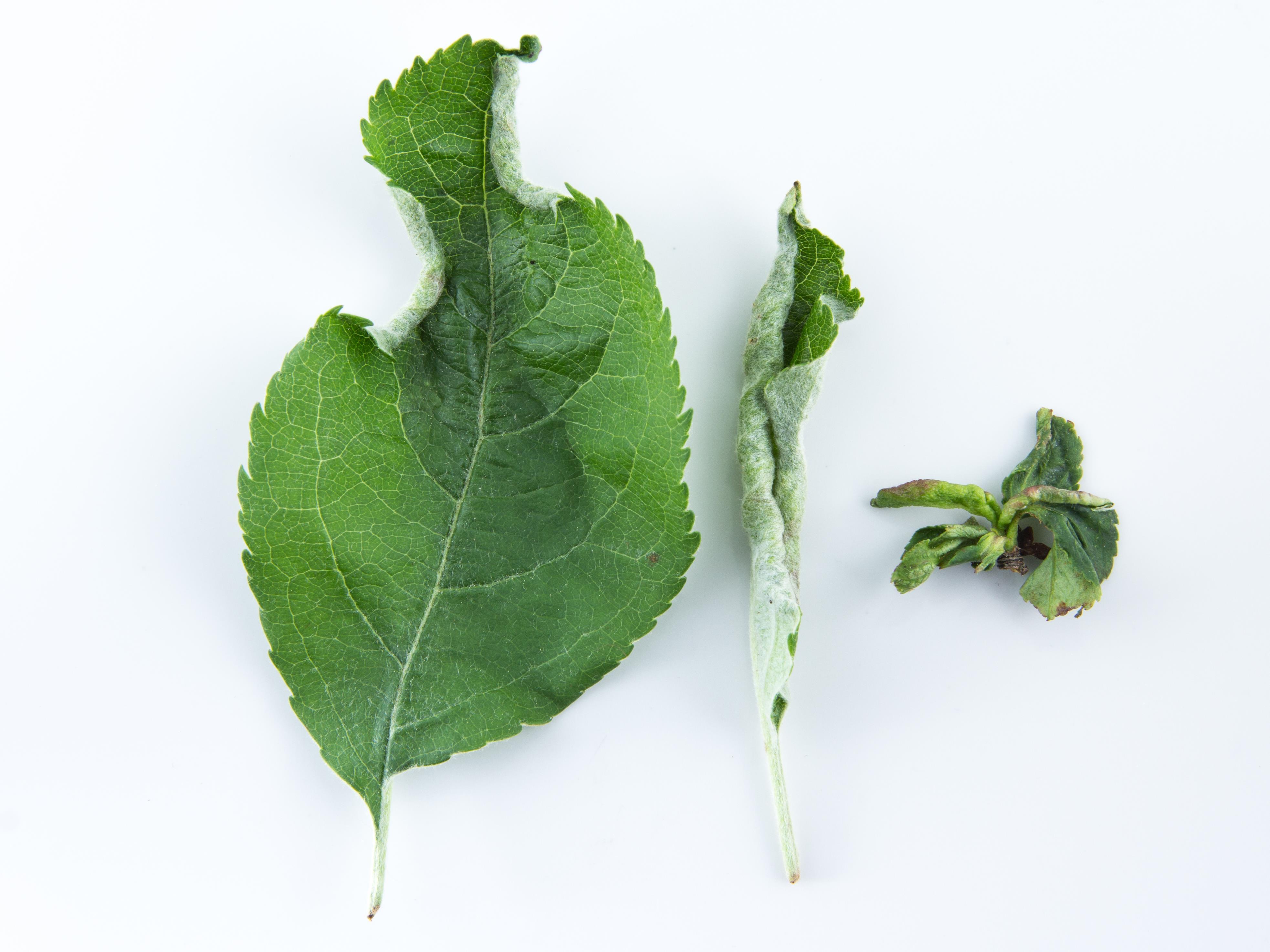 Description: Dommages de la cécidomyie du pommier sur du feuillage de pommier : les larves de Dasineura mali, lorsqu'elles se développent à sur les feuilles des plantes appartenant au genre Malus, causent un enroulement partiel ou complet des bordures de celles-ci. Les feuilles infestées ont tendance à se déformer et à devenir cassantes. Une coloration rouge, violacée ou brunâtre est aussi généralement présente sur le feuillage attaqué.