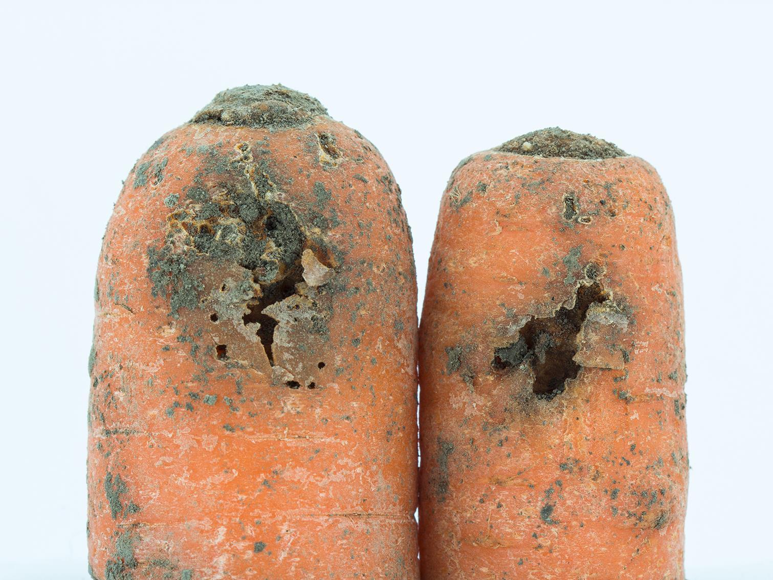 Description: Dommages causés par la larve du charançon de la carotte : les dommages causés par Listronotus oregonensis sur les racines de carottes sont généralement présents dans le tiers supérieur de cet organe. Les larves creusent des galeries dans la carotte en laissant en surface une mince couche de cellules qui s'affaisse fréquemment au courant de la saison de croissance. L'affaissement de cette couche de cellules permet de voir l'ampleur des galeries présentes dans la racine.