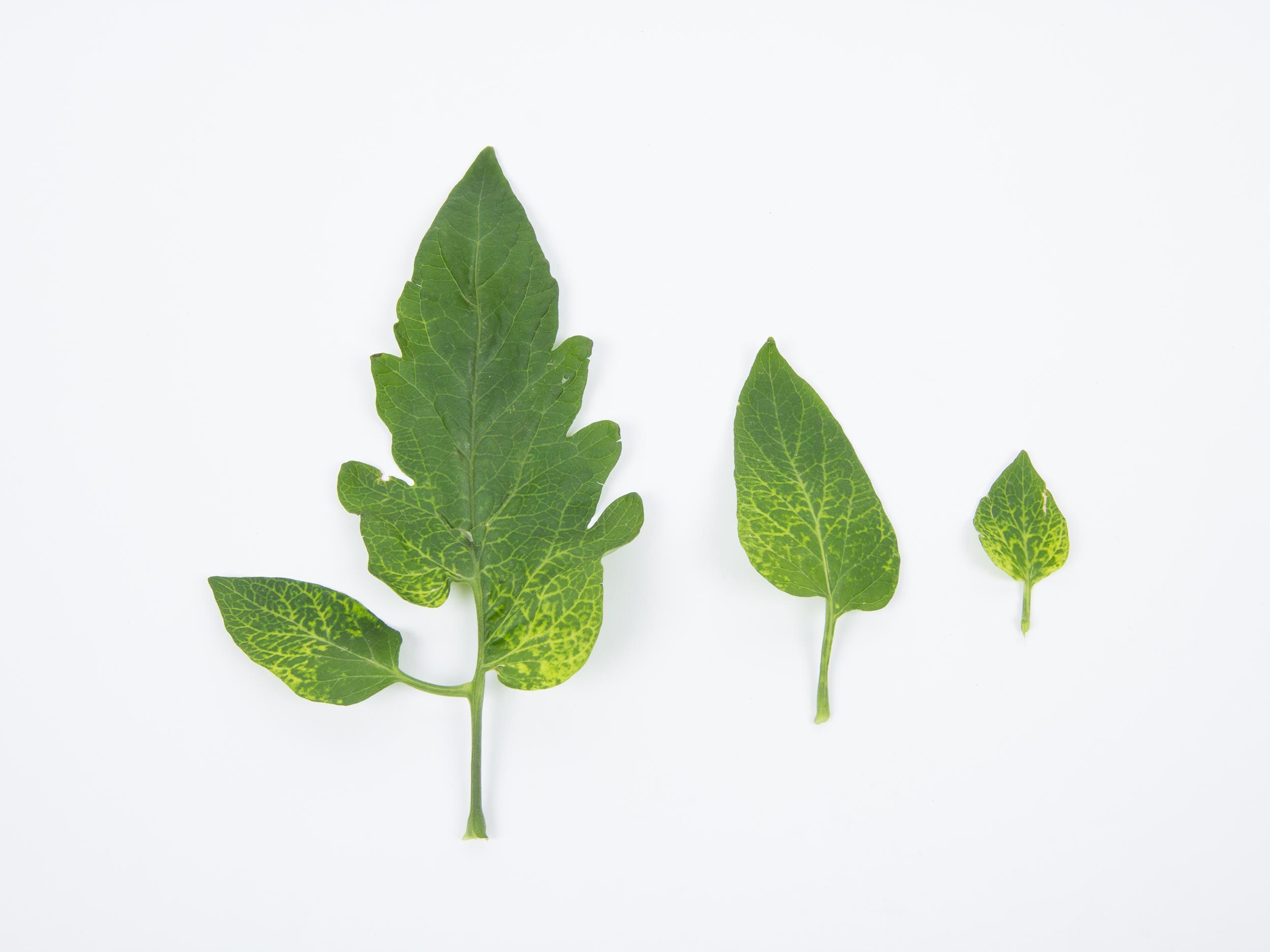 Description: Les nervures principales et secondaires des folioles de tomate de serre (cv 'torero') sont partiellement ou complètement jaunes. Les tests de laboratoire ont révélé la présence du virus de la mosaïque du pépino (PepMV).