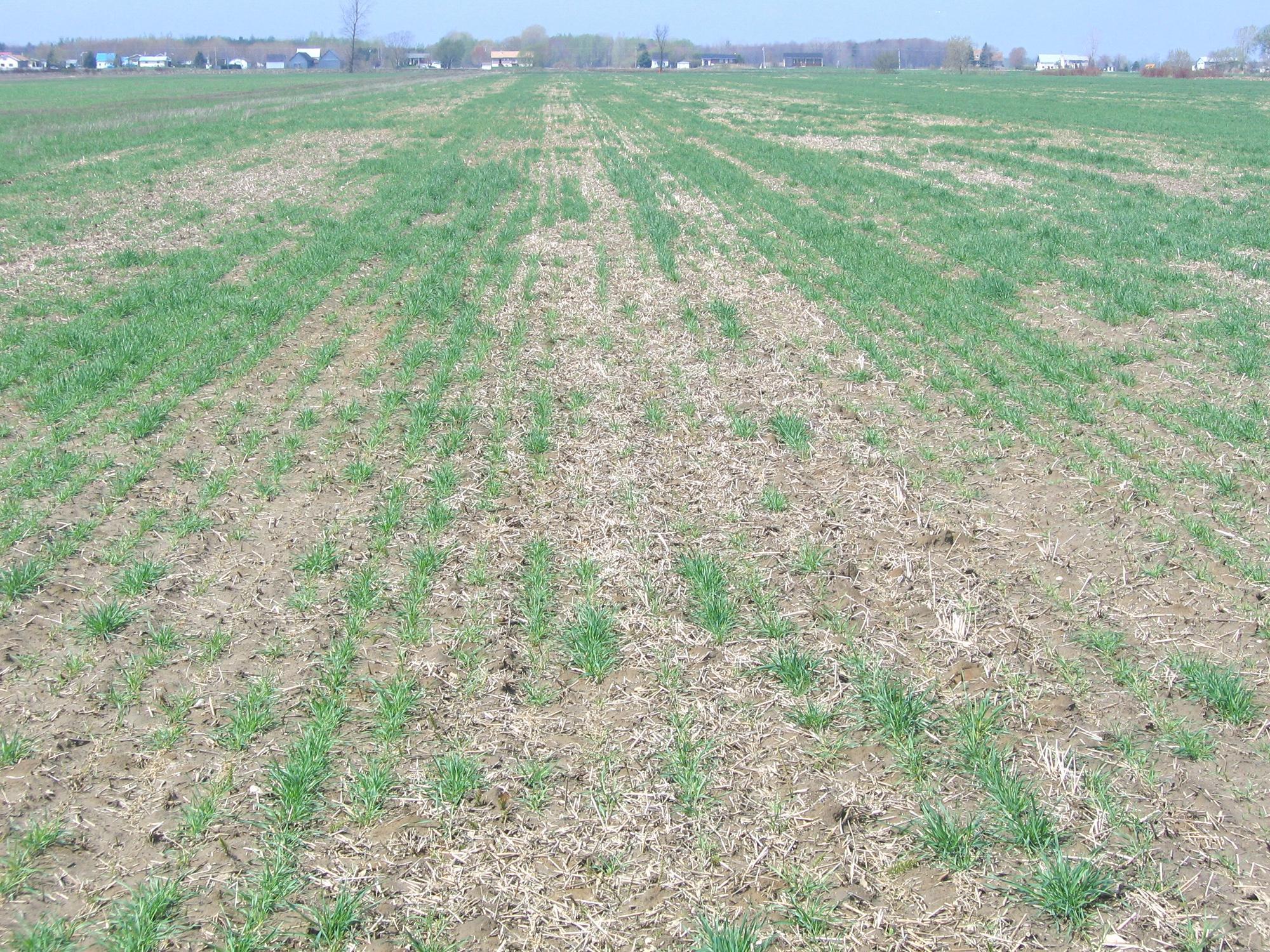 Description: Dans un champ de blé d’automne, les zones dégarnies sont composées de plants qui ont un faible développement ou qui sont desséchés à la suite d’une mauvaise survie à l'hiver. Les zones où les plants sont morts correspondent à de petites baissières où l'eau s'est accumulée et où les plants sont morts par asphyxie par la glace (gel hivernal). Cette culture de blé d'automne a été ensemencée sur un sol non nivelé. La photo a été prise au début mai.