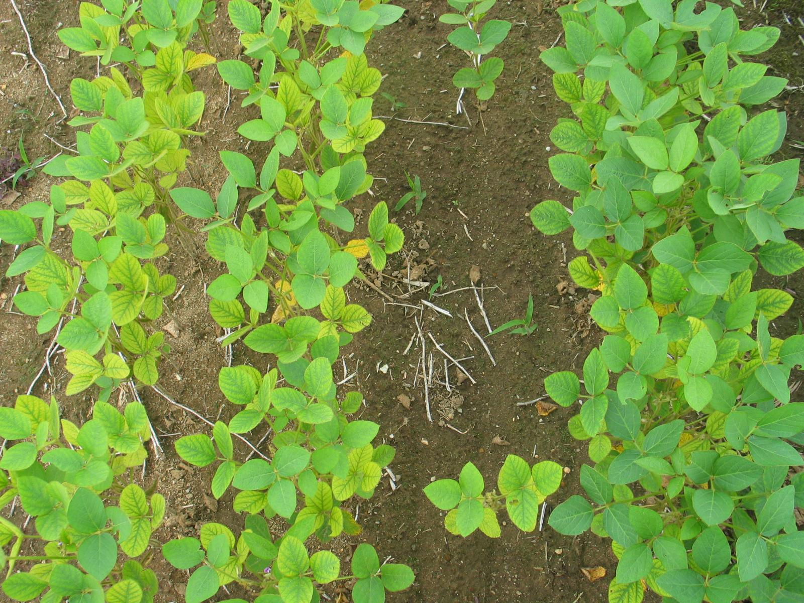 Description: Sur de jeunes plants de soya, tous les niveaux de feuilles présentent un jaunissement entre les nervures qui demeurent vertes. Les plants de gauche sont plus carencés que ceux de droite. Ils sont plus petits et moins denses. Les analyses de sol et foliaire ont révélé une carence en manganèse. Les symptômes sont caractéristiques de cette carence. Il est intéressant de noter la grande variabilité du manganèse à l'intérieur d'un même champ.