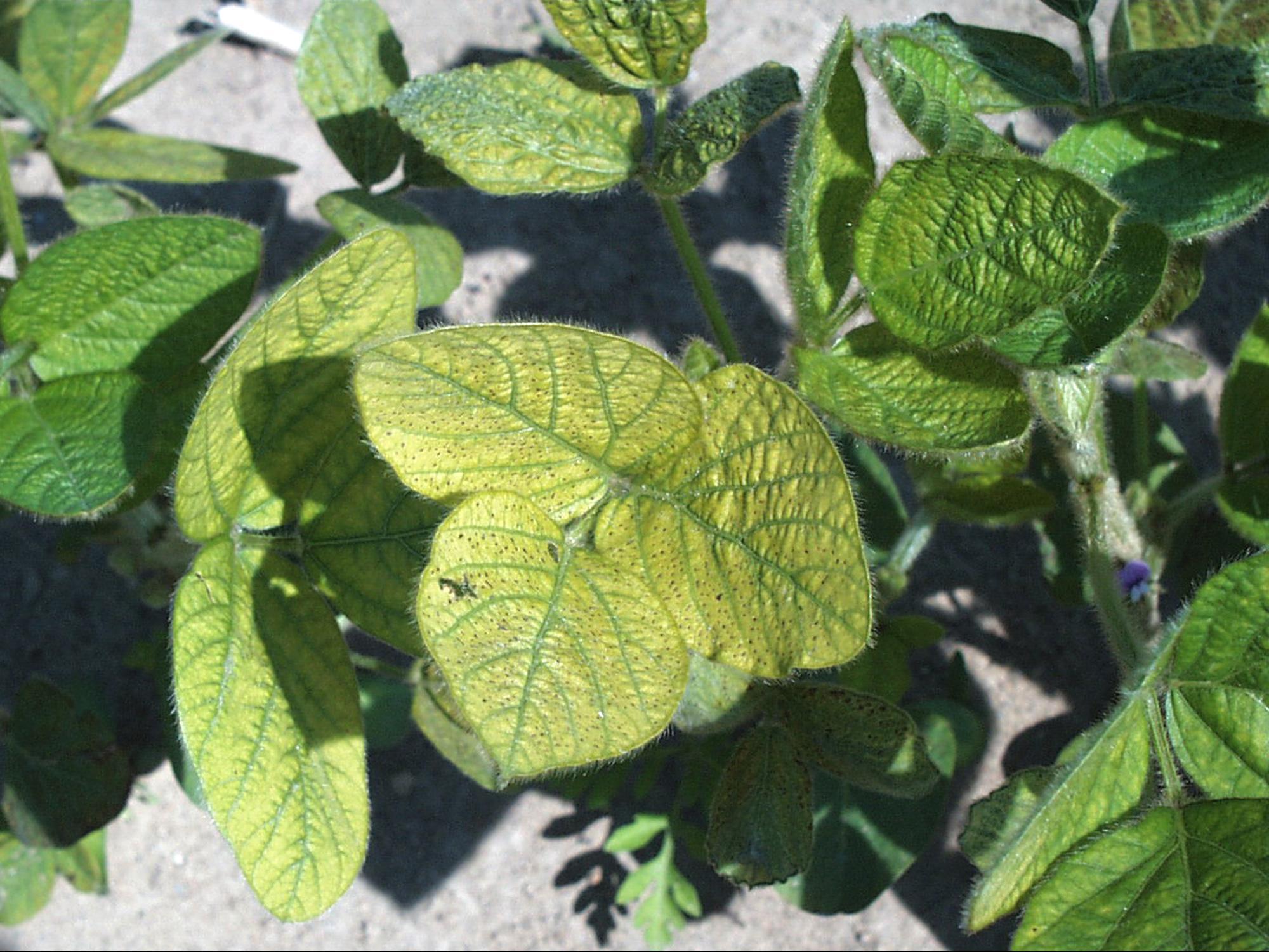 Description: Sur de jeunes plants de soya, les feuilles sont fortement jaunies entre les nervures qui demeurent vertes. Présence de petites taches brunes nécrotiques entre les nervures. Ce symptôme est caractéristique de la carence en manganèse chez le soya.