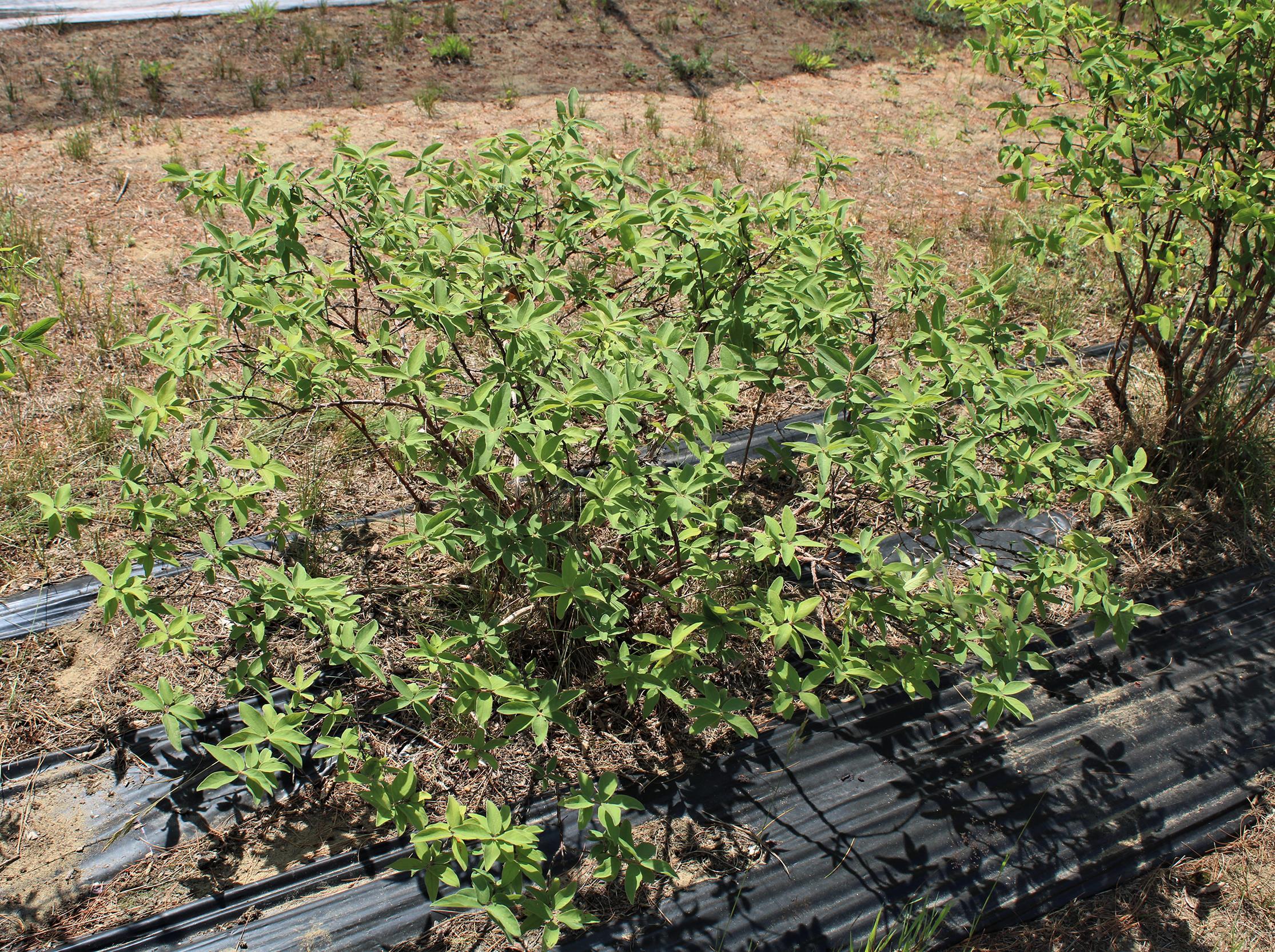 : Ce camérisier subit une carence en azote. Le plant est peu vigoureux, le feuillage est clairsemé, chétif et pâle.