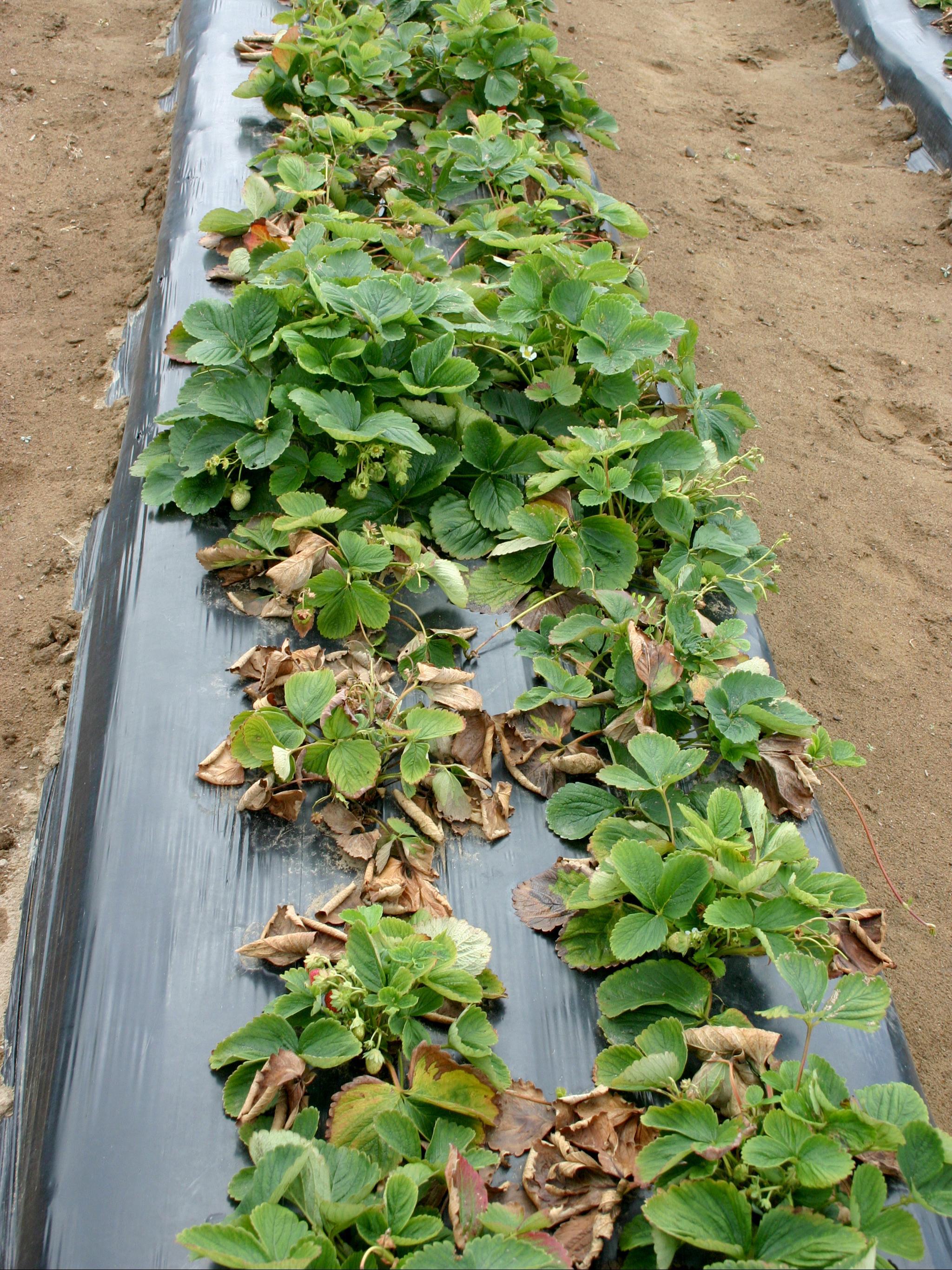 Description: Au champ, les feuilles basales de plants de fraisiers sont flétries et desséchées. Les plants s'affaissent au sol, mais les nouvelles feuilles demeurent vertes. Ces symptômes sont caractéristiques du flétrissement verticillien (verticilliose) causé par le champignon Verticillium sp.