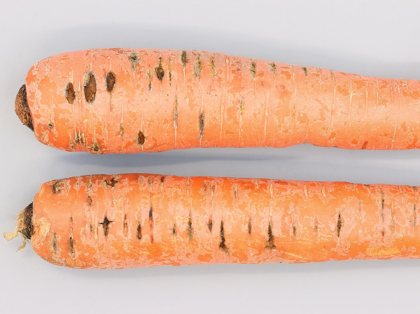 Description: Sur des carottes provenant d’un entrepôt, présence de lésions ovales, brunes à noires, horizontales et suivant les lenticelles, situées majoritairement dans la partie supérieure de la racine. Les lésions sont sèches et superficielles. Les tests de laboratoire ont révélé la présence du champignon Fusarium sp., responsable de la pourriture sèche fusarienne. Notez que les champignons Pythium sp. et Rhizoctonia sp. n’ont pas été isolés des dommages. La conseillère agricole mentionne qu’à la récolte, aucune lésion n’a été observée sur les carottes. C’est lors de l’emballage, après le lavage, qu’une forte proportion de carottes présentait ce type de lésions, occasionnant des pertes importantes.