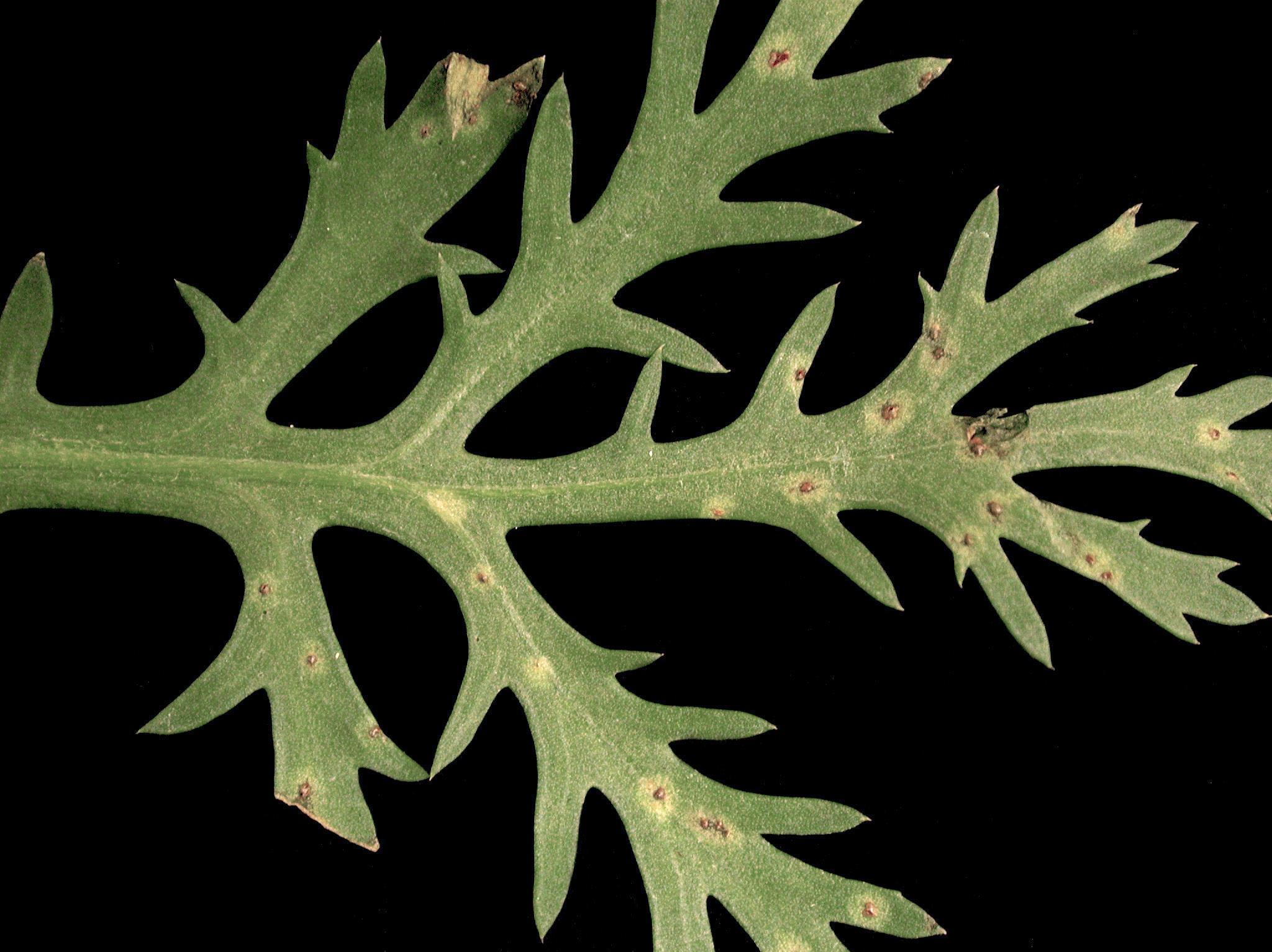 Description: La feuille présente des pustules rouille à brunes entourées d’un halo vert pâle à jaune. Les observations microscopiques ont révélé la présence du champignon Puccinia tanaceti (syn. P. chrysanthemi), responsable de la rouille brune du chrysanthème.