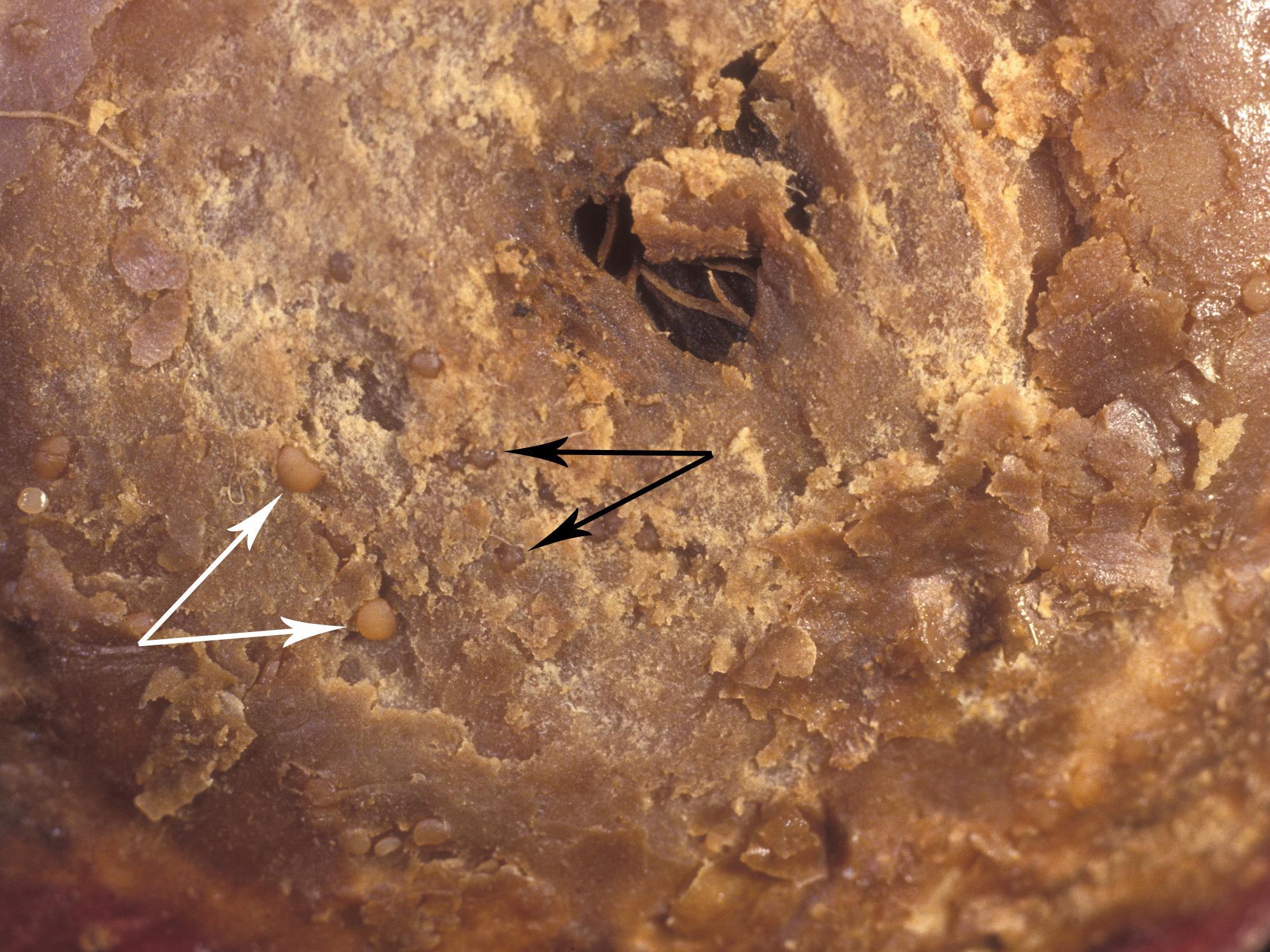 Description: Une vue rapprochée d’une racine tubérisée d’un rutabaga (cv 'Laurentien') provenant d’un entrepôt montre une importante pourriture brune et ferme de l'épiderme. Dans la zone pourrie, présence de nombreux sclérotes immatures beiges (flèches blanches) ou bruns (flèches noires) et de forme sphérique. Les observations microscopiques ont révélé la présence du champignon Sclerotium sp., responsable de la pourriture sclérotique. Il s’agit probablement de Sclerotium rolfsii.
