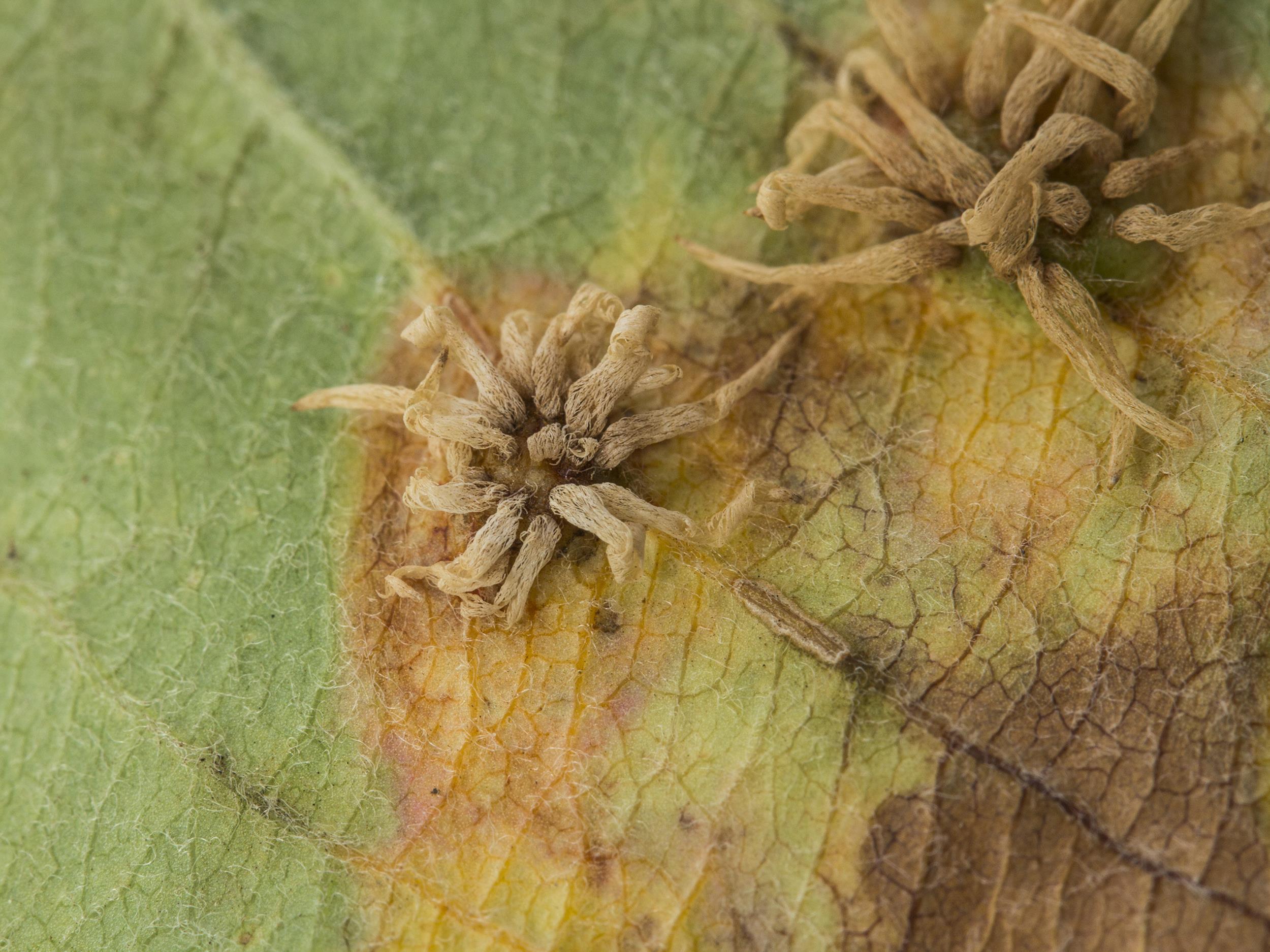 Description: À la face inférieure d’une feuille de pommetier ornemental, une vue rapprochée des taches montre des écidies beiges mesurant environ 2 à 5 mm de longueur. À la face supérieure, des taches brun foncé, entourées d’un halo jaune vif, étaient présentes vis-à-vis les écidies (non visible ici). Les observations microscopiques ont révélé la présence d’écidiospores caractéristiques du champignon Gymnosporangium sp., responsable d’une rouille. Il s’agit probablement de la rouille de l'aubépine (G. globosum), à cause de la longueur importante des écidies observées à la face inférieure des feuilles.