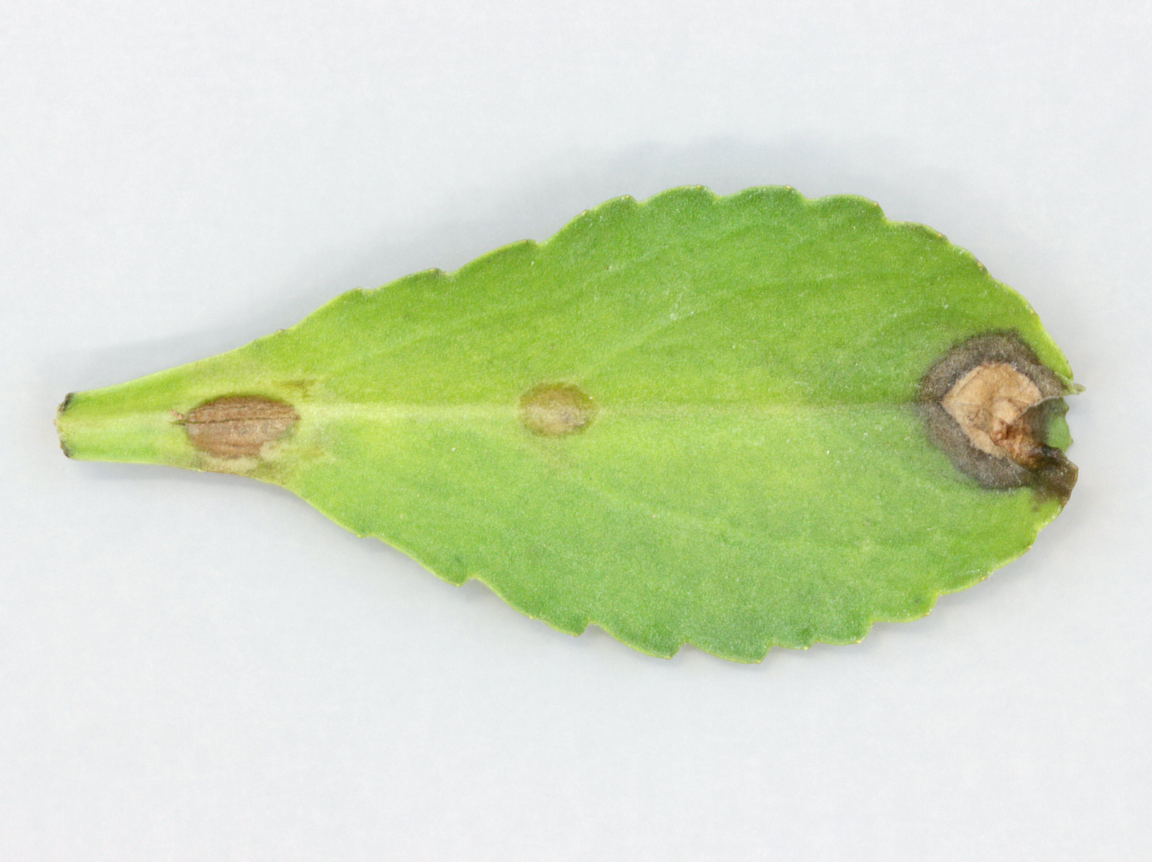 Description: Les feuilles de marguerites vivaces cultivées en serre montrent des taches de différente nature selon leur stade de développement. Les taches semblent débuter par l'apparition d'un halo jaune puis un brunissement apparaît ensuite au centre de ce halo (non visible ici). Certaines taches de plus grandes dimensions sont beiges à brunes, sèches et ne portent pas de halos jaunes. Les taches sont présentes sur les trois niveaux de feuille. Les tests de laboratoire ont révélé la présence du champignon Myrothecium roridum. Ce champignon cause des taches foliaires chez plusieurs plantes ornementales.