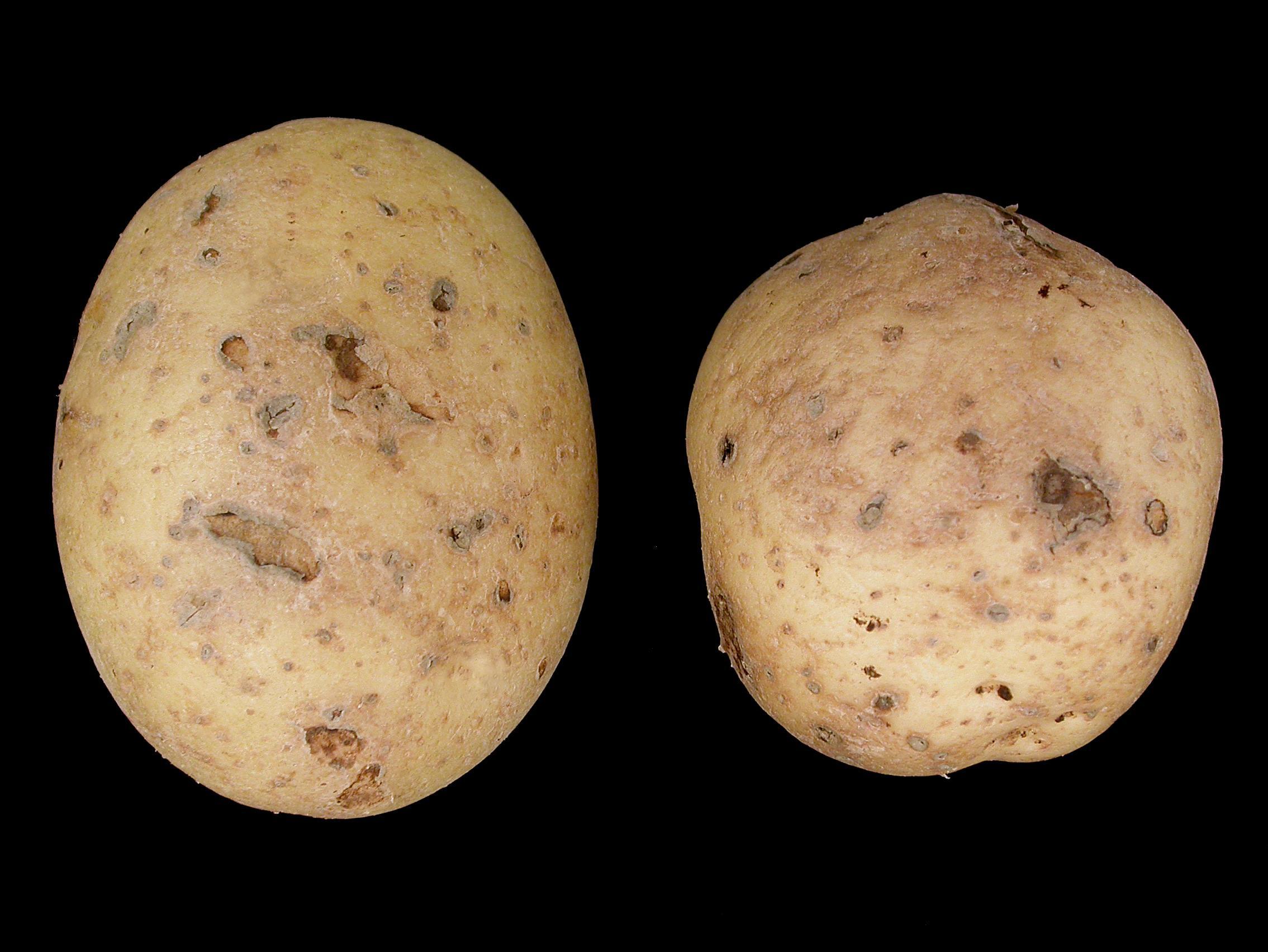 Description: Des tubercules de pomme de terre (cv 'Harmony') provenant d’un entrepôt montrent des taches brunes, plutôt circulaires, dépressives et d’une dimension variable. Les taches sont superficielles et localisées essentiellement aux lenticelles. Les tests de laboratoire ont révélé la présence du champignon Colletotrichum coccodes, responsable de la dartrose chez la pomme de terre.
